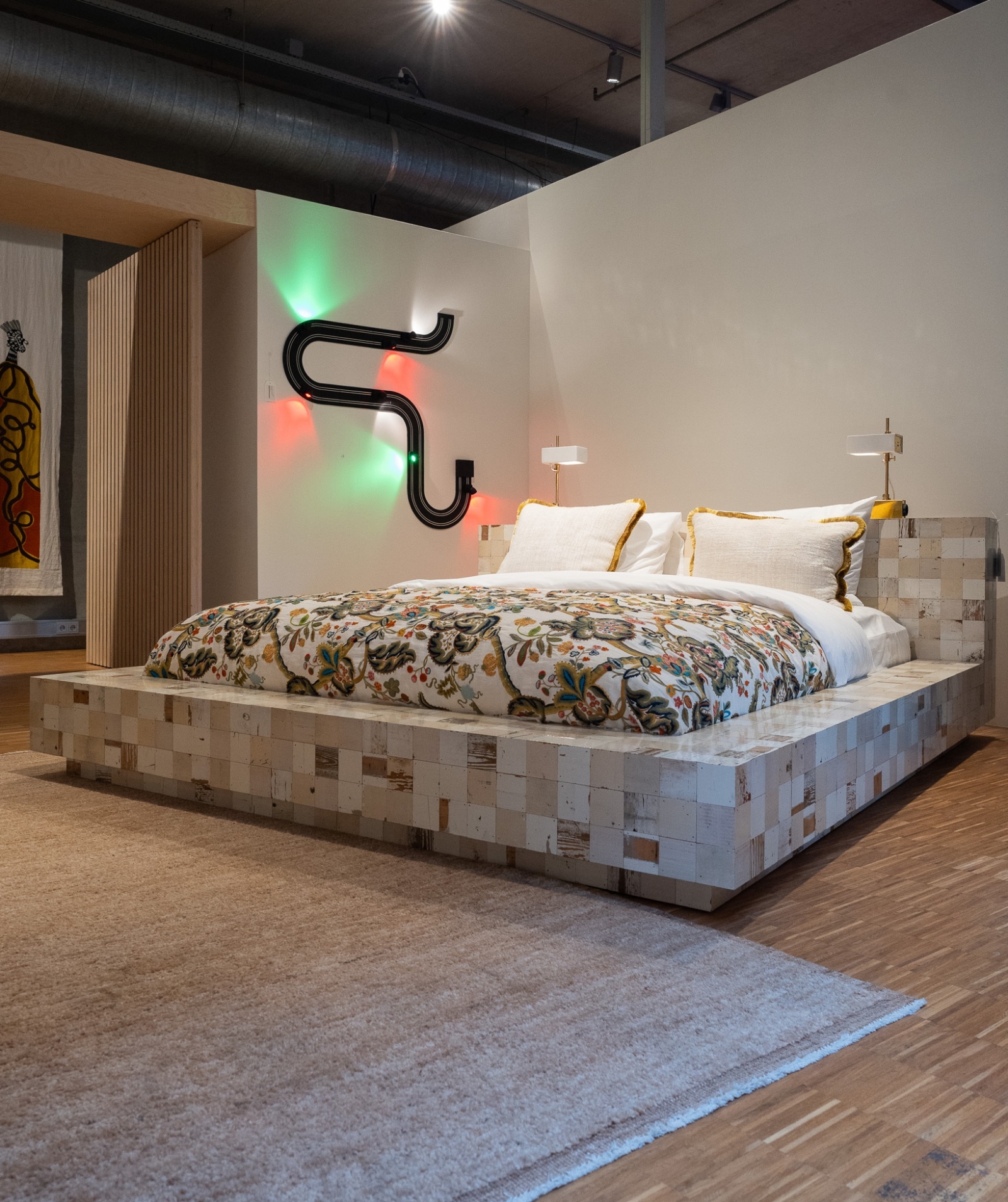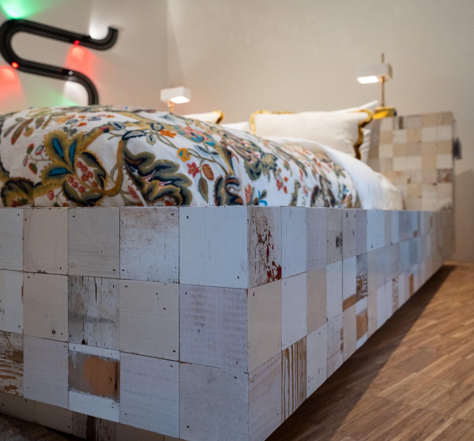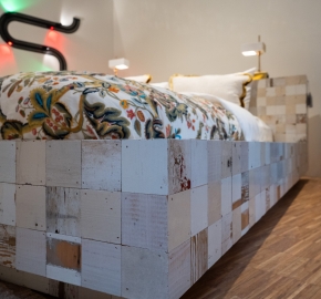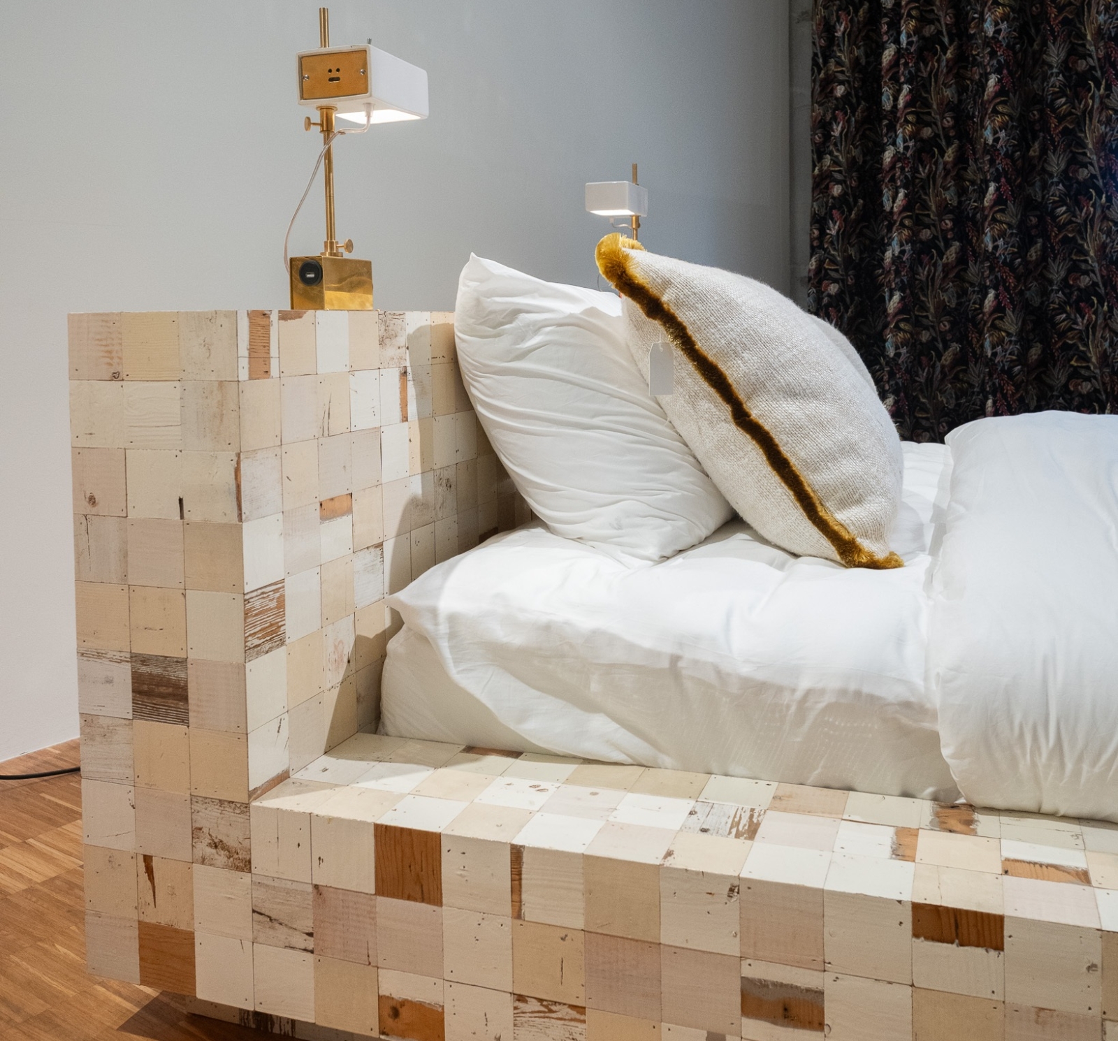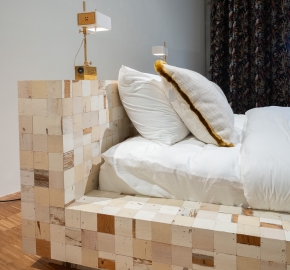 De Bed 75×75 blokjes inclusief 2 lampen van Piet Hein Eek is een grafisch en ambachtelijk bedontwerp opgebouwd uit zijn iconische sloophouten blokjes. De lichte houttinten geven het geheel een rustige, bijna architectonische uitstraling, terwijl de variatie in houtstructuur zorgt voor subtiliteit en diepte. De bijgeleverde lampen sluiten naadloos aan op het ontwerp en versterken het karakter zonder te overheersen.