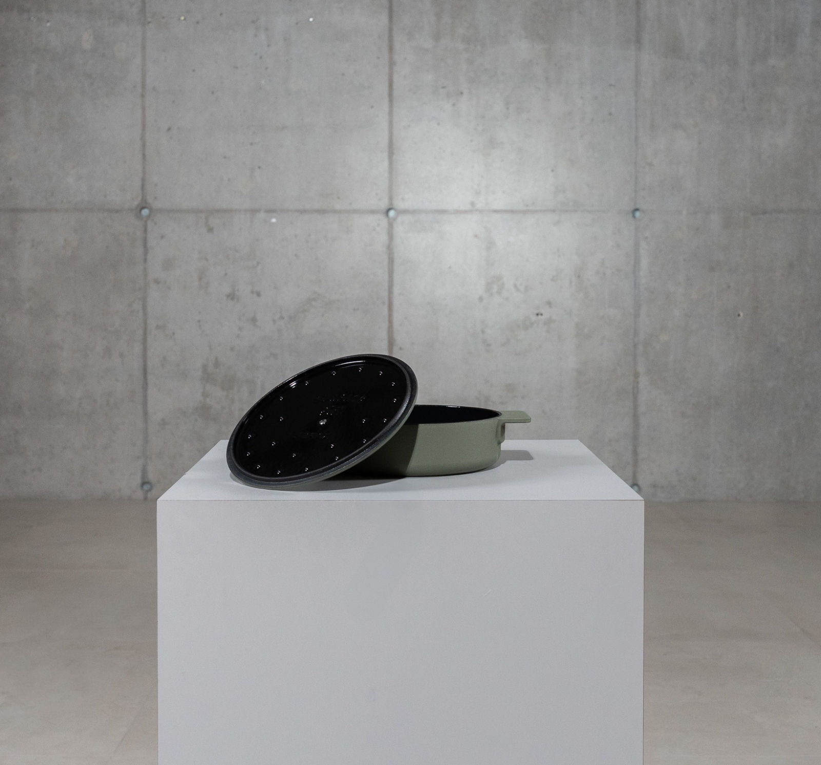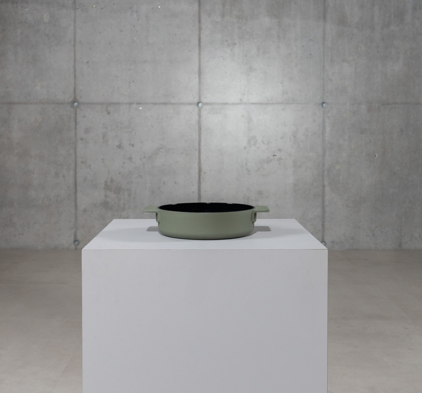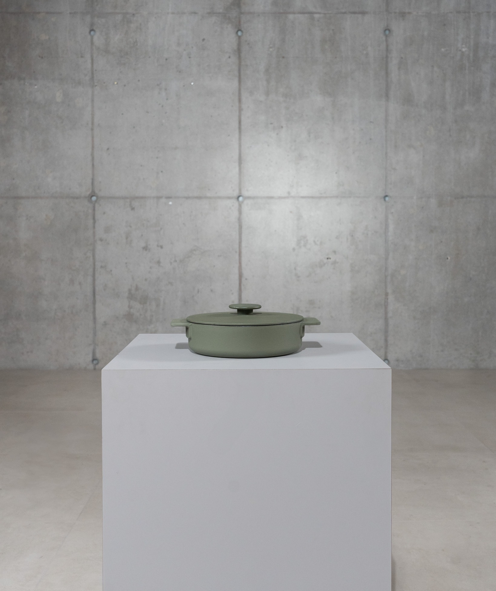 De Braadpan M Camogreen is onderdeel van de “Surface”‑collectie van Serax, ontworpen samen met chef‑kok Sergio Herman. De pan combineert klassieke functionaliteit met strak, ingetogen design: de matte “camogreen” geglazuurde afwerking en de robuuste gietijzeren constructie maken er een object van dat even goed past in een moderne als industriële keuken.