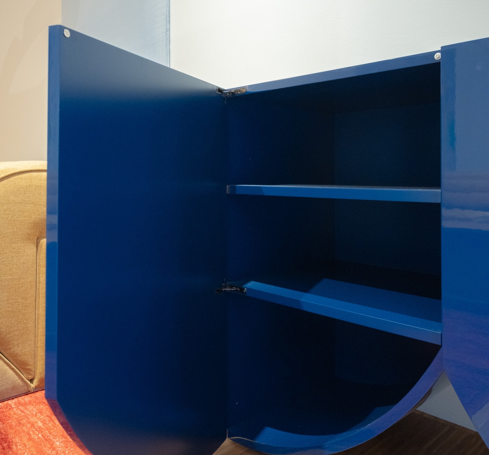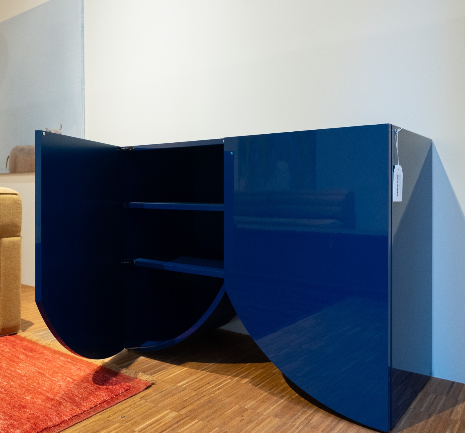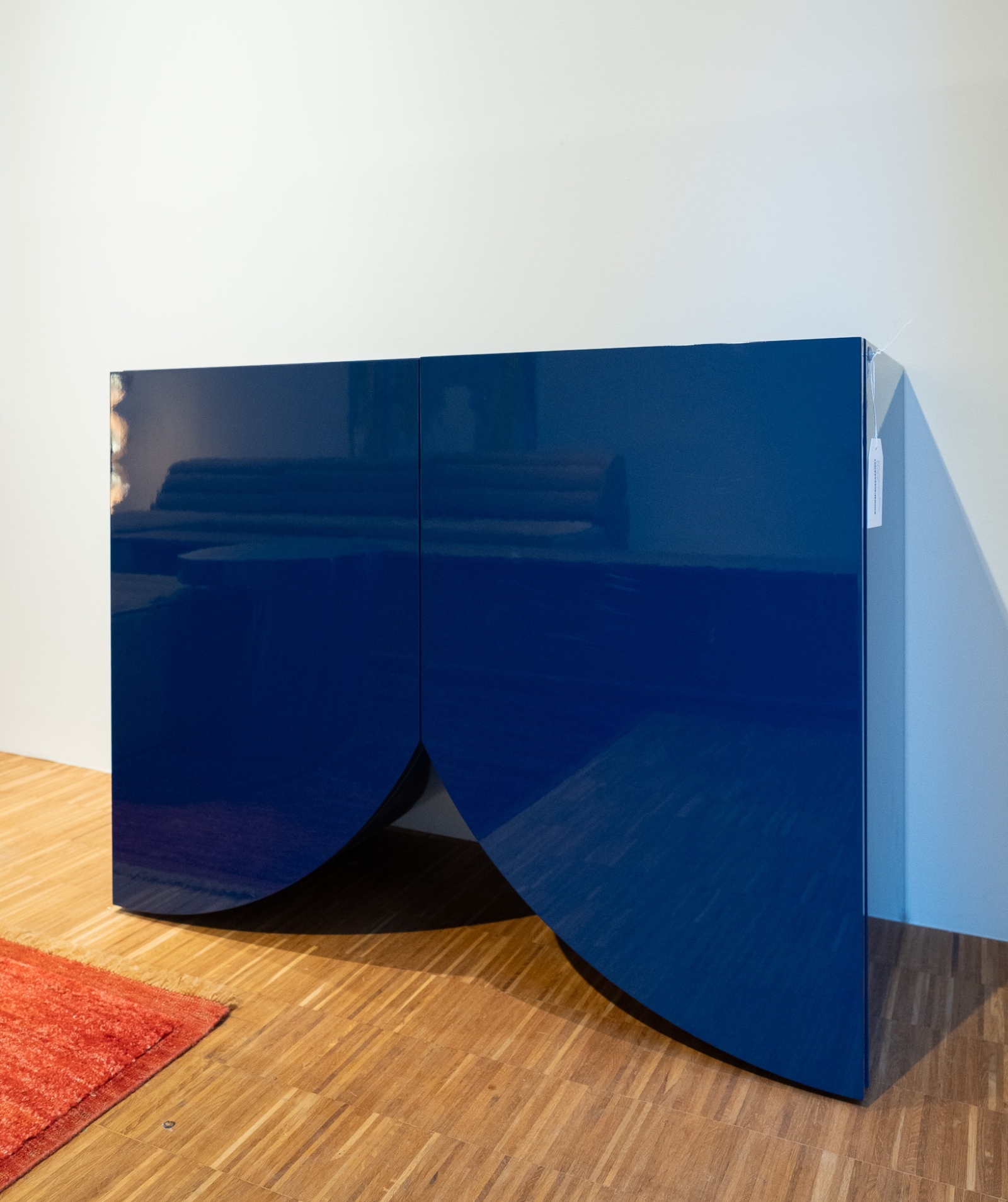 De Bridges Cabinet Small Curtain in 90S Blue van BD Barcelona Design is een kast met een sterk concep. Het ontwerp refereert aan de architectuur van bruggen — een brug tussen functionele opbergoplossing en sculpturaal object — en combineert massief materiaal met een subtiel, gekleurde gordijn-achtige afwerking die ritme en tactiliteit toevoegt aan het front.