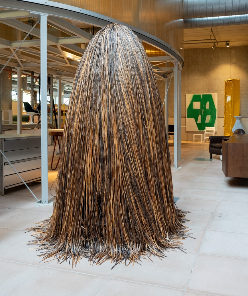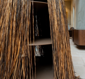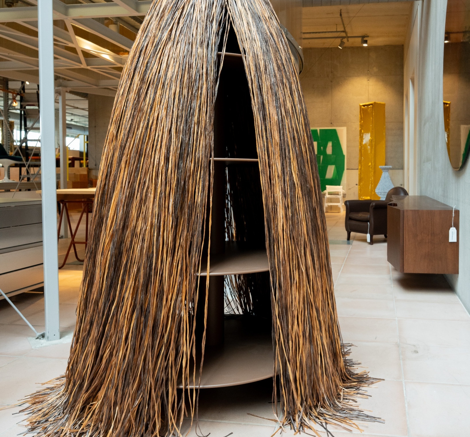 De Cabana Cabinet van Edra, ontworpen door Fernando en Humberto Campana, is een opbergobject dat aanvoelt als een kunstwerk. Achter de speelse “cabana” van lange, handgeknoopte strengen viscose raffia zit een verborgen draagstructuur met ronde plateaus. Je krijgt dus het beste van twee werelden: een zachte, bijna textiele uitstraling aan de buitenkant en verrassend praktische opbergruimte aan de binnenkant.