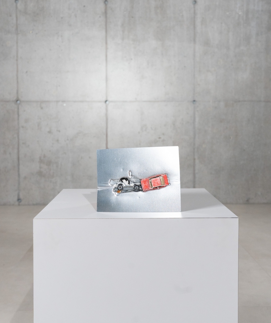 Constructie: aluminium plaat waarin twee originele speelgoedauto’s diep zijn geperst
