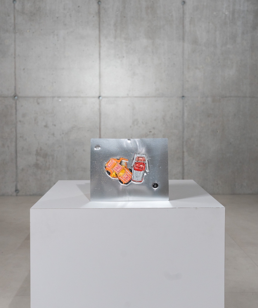 Constructie: aluminium plaat waarin twee originele speelgoedauto’s diep zijn geperst
