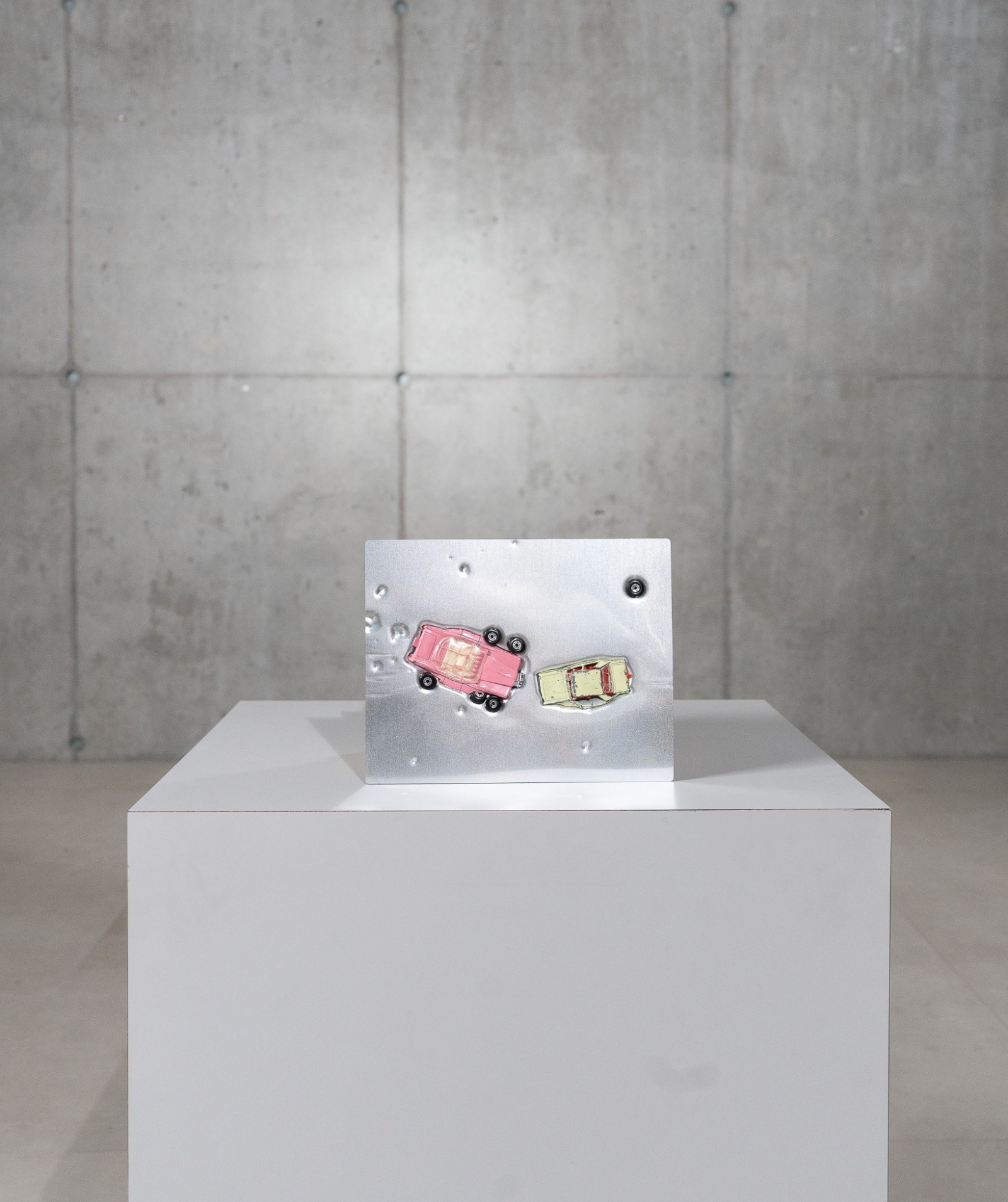 Constructie: aluminium plaat waarin twee originele speelgoedauto’s diep zijn geperst