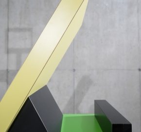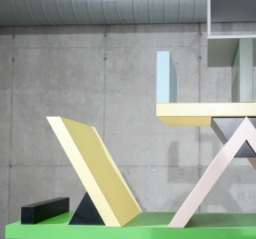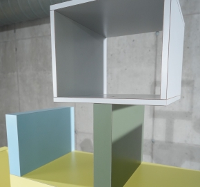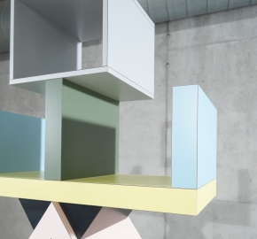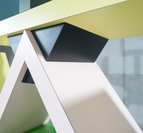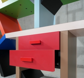Massief houtconstructie, bekleed met kleurrijk plastic laminaat; MDF-details