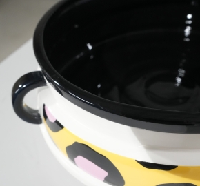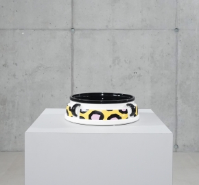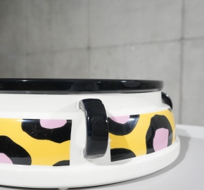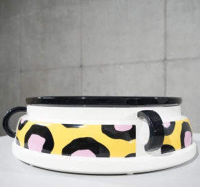 Cauliflower is een speels uitgesproken fruit- of koelkastkom uit 1985, ontworpen door patroonmeester Nathalie Du Pasquier. Ondanks de naam is het een hommage aan de charme van groenten: een ronde keramische schaal met een levendig patroon van roze vlekken omlijst met zwarte contouren op een zonnige gele achtergrond. Handgemaakt en met de hand beschilderd, met vrolijke decals die de Memphis-stijl stijlvol weerspiegelen.
