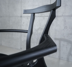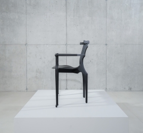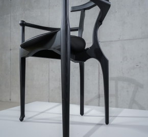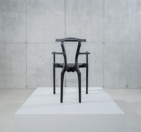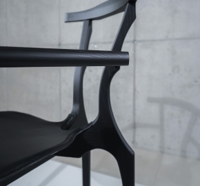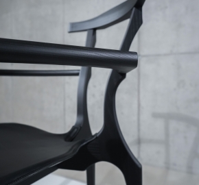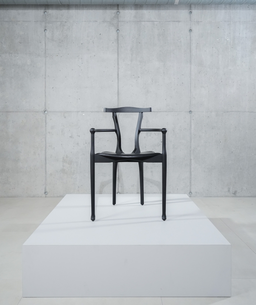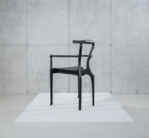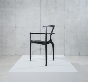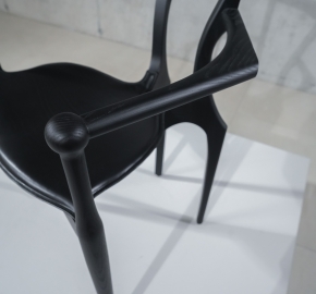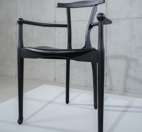 Chair Gaulino all black. De Gaulino Chair, ontworpen door Oscar Tusquets in 1987, is een meesterwerk dat de invloeden van Antoni Gaudí en Carlo Mollino combineert. Deze stoel is vervaardigd uit massief essen en met de hand bekleed met rijk leer, wat zorgt voor een ambachtelijke en esthetische intensiteit. Ondanks zijn verfijnde uitstraling blijft de stoel licht, praktisch en stapelbaar.