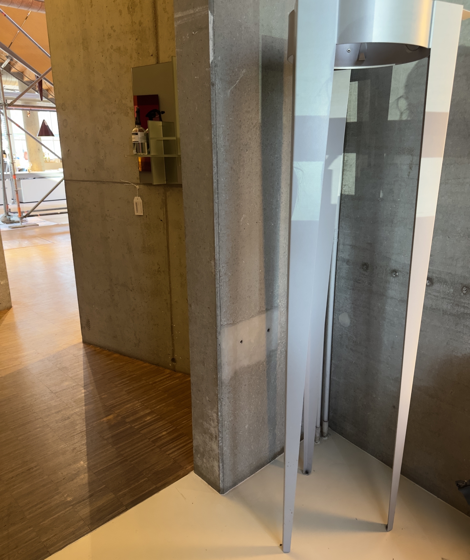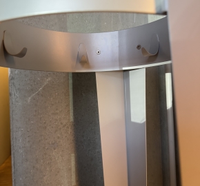 Designkapstok uit de Chase-serie van Van Esch, ontworpen door Michiel van der Kley. De kapstok heeft een slanke stalen constructie met een driepoots basis en zes haken die aan de binnenzijde van de ring zijn geplaatst. Hierdoor blijven jassen deels verborgen en behoudt het object zijn grafische vorm, zelfs wanneer hij in gebruik is.
