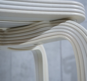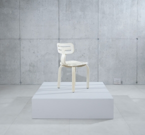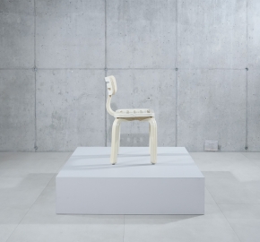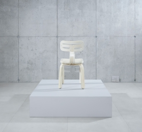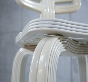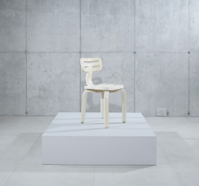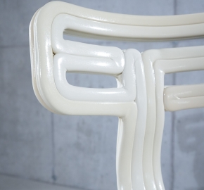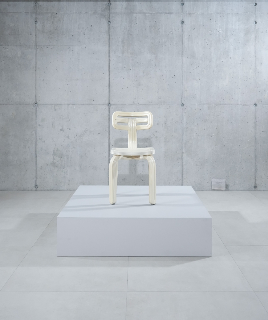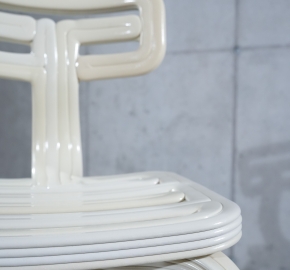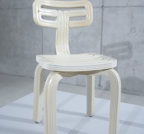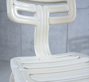 De Chubby Chair van Dirk van der Kooij in wit. De Chubby Chair ontstond uit zijn fascinatie voor 3D-printen met lage resolutie. De unieke, speelse vorm is het resultaat van een zelfontwikkelde plasticextruderende robot en de beperkingen daarvan. Door een eenvoudig patroon van structurele lijnen en sporadische toevoeging van pigment, is elke stoel uniek in kleur. Exclusief verkrijgbaar bij VOS in diverse kleuren.