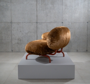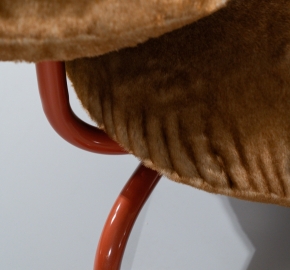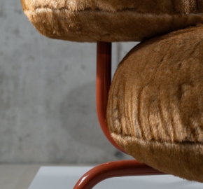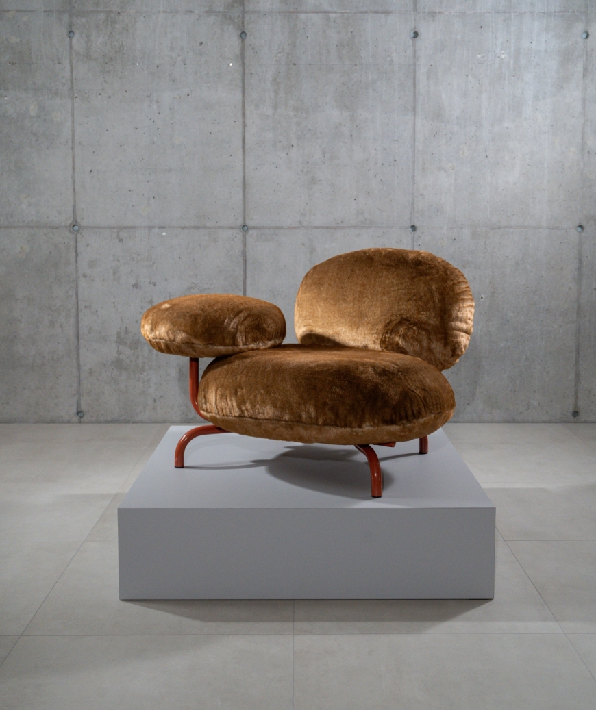 De fauteuil is samengesteld uit kussens met een structurele vorm die doen denken aan poederdonsjes. Deze kussens zijn bevestigd aan een metalen buisframe dat vrijwel onzichtbaar is.