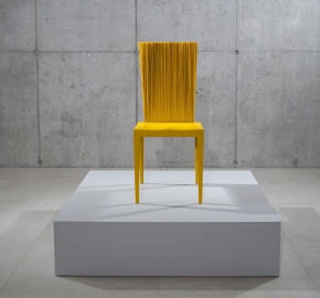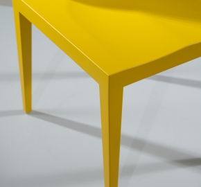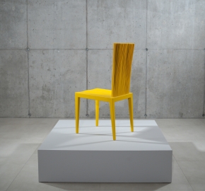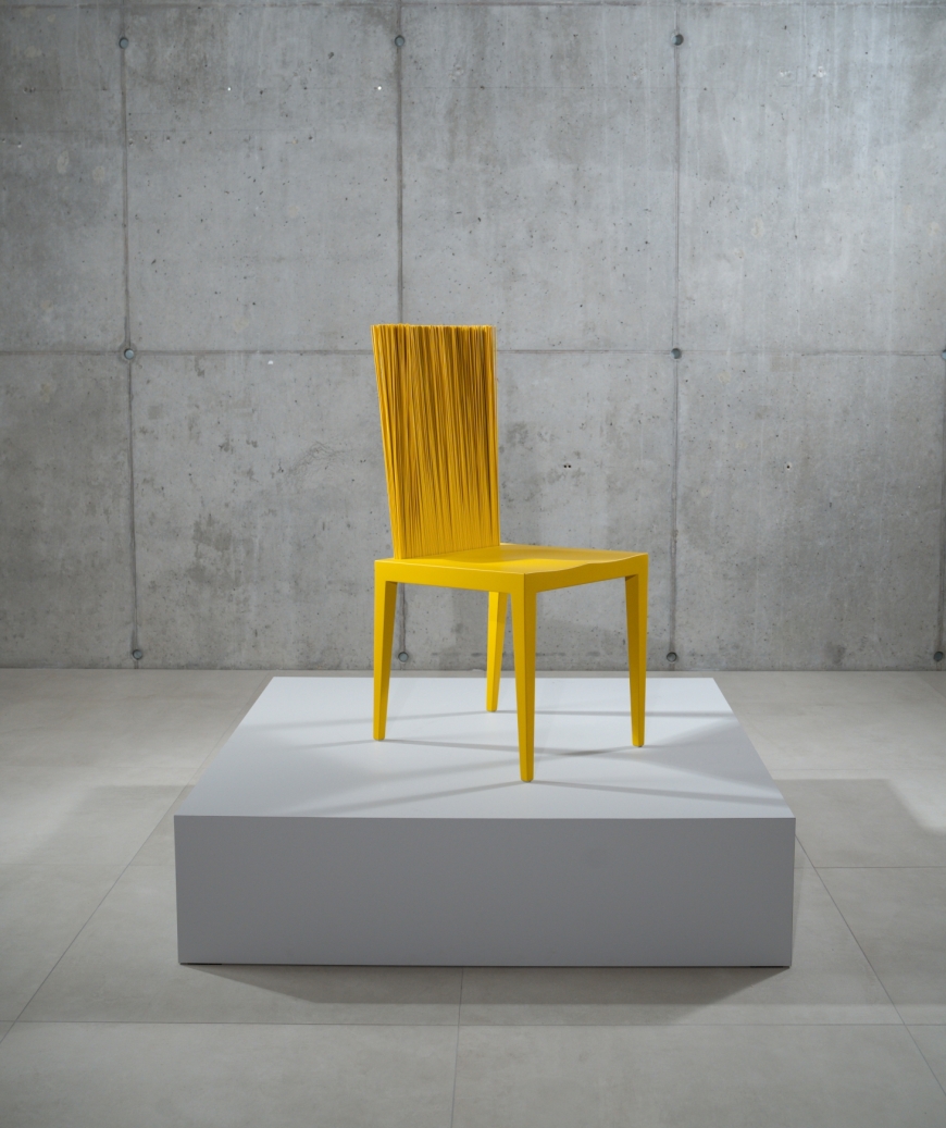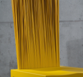 Dankzij de flexibele rugleuning vormt deze stoel, gegoten in polyurethaan met een metalen pantser, een schakel tussen stijfheid en flexibiliteit. De rugleuning wordt gevormd door een reeks PVC-stelen die zich modelleren met gebruik in een vrije positie.