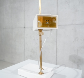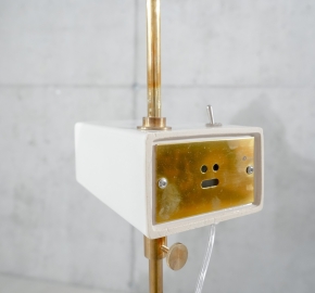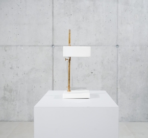 Eenmalbureaulamp in wit. Het idee achter deze lamp is simpel: één ontwerp, één mal, maar meerdere toepassingen. De lampen, in hun pure vorm, zijn nu afgewerkt met diverse glazuren en verpakt in de eerste zelfgemaakte dozen.