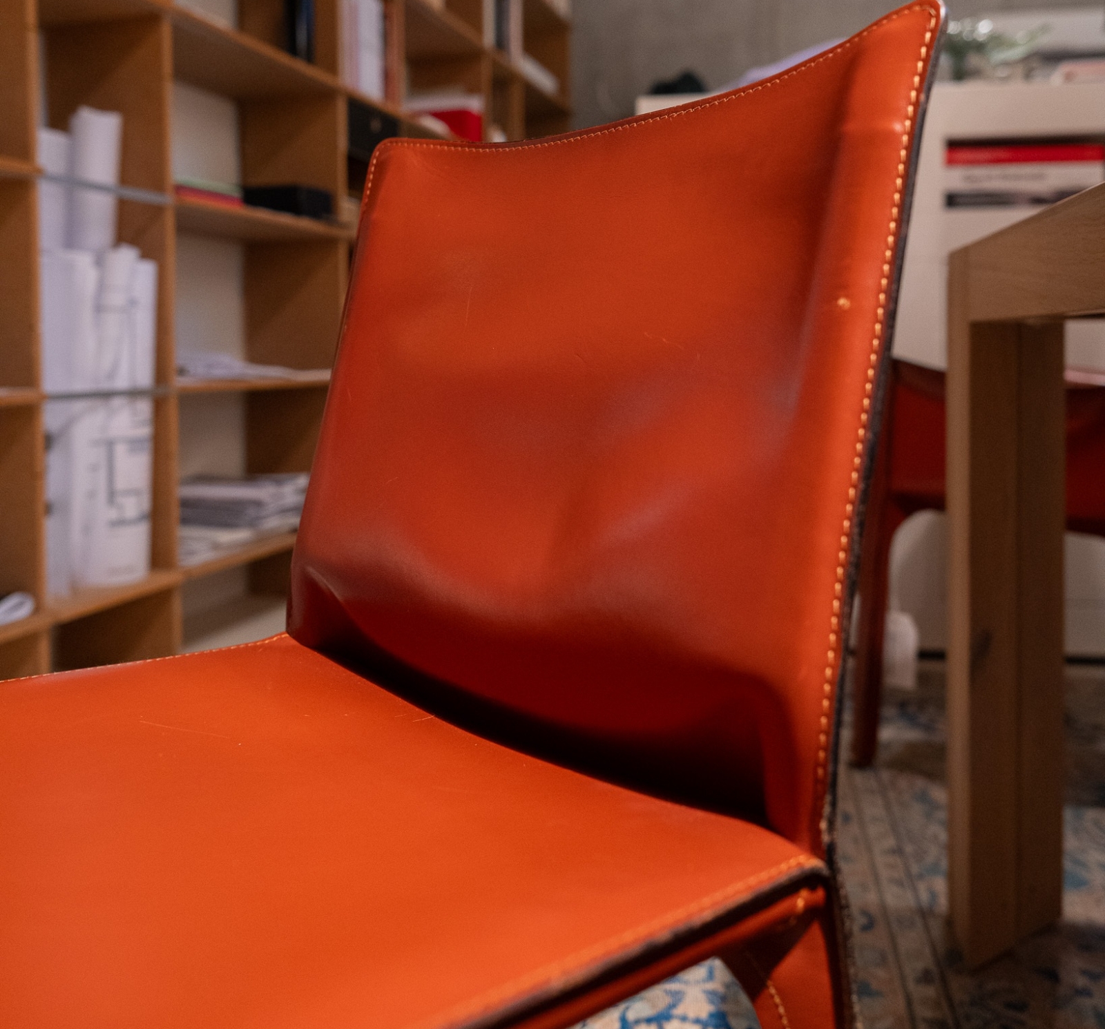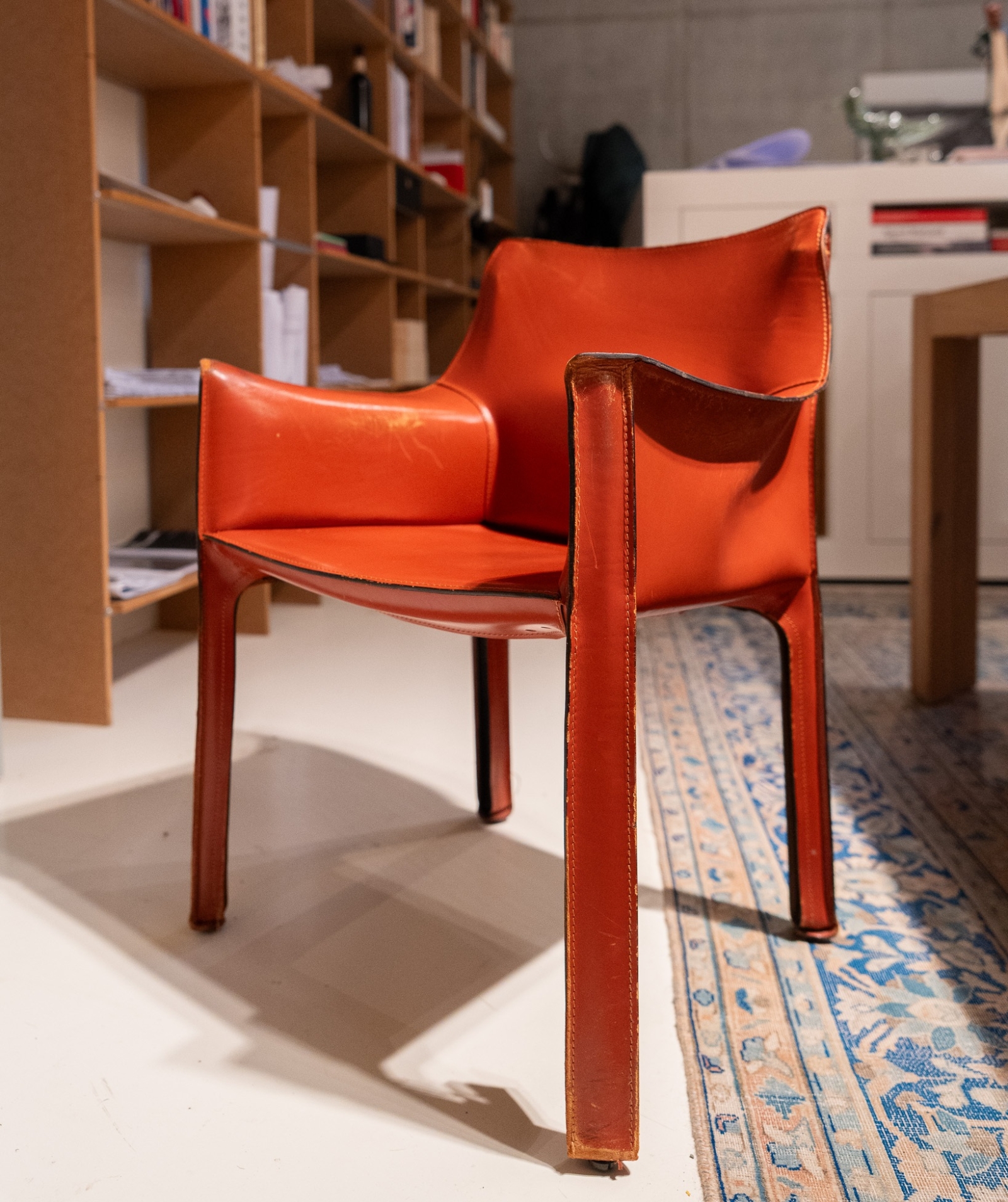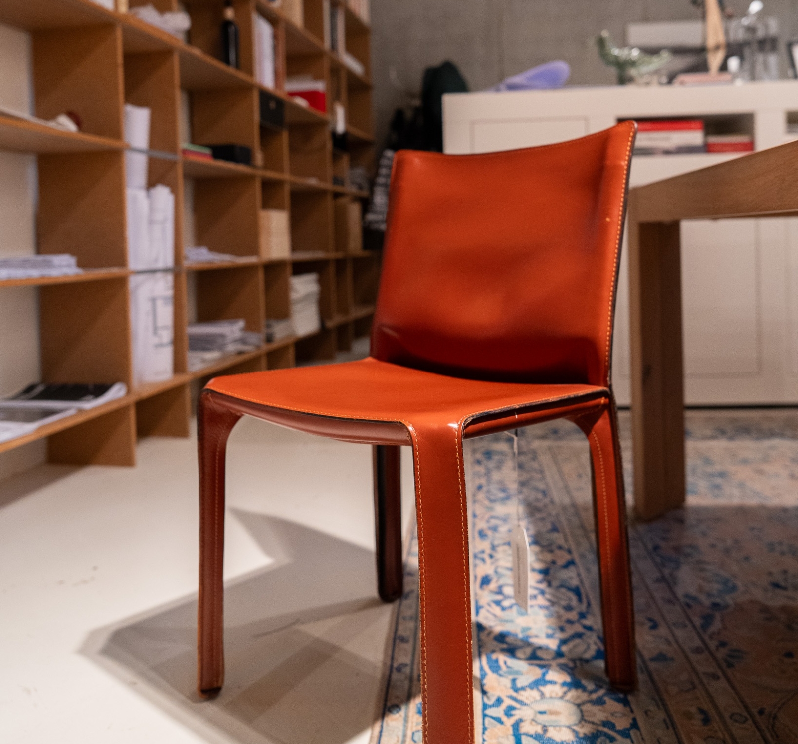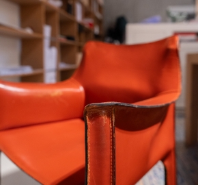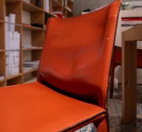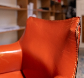 De Cassina Cab Stoel is een iconische eetkamerstoelserie van Cassina, ontworpen door Mario Bellini in de jaren ’70 en een klassieker binnen modern Italiaans meubeldesign. De Cab stoel werd ontwikkeld met het idee van de relatie tussen skelet en huid: een slank, stalen frame dat volledig wordt bekleed met tuigleer, waardoor de stoel een bijna organische, enveloppen vorm krijgt.