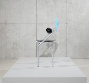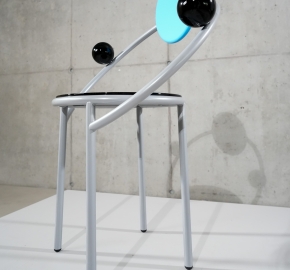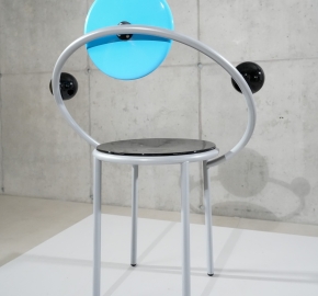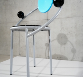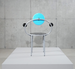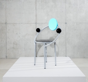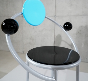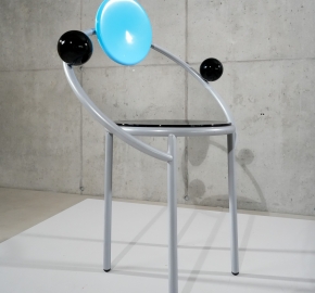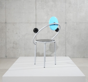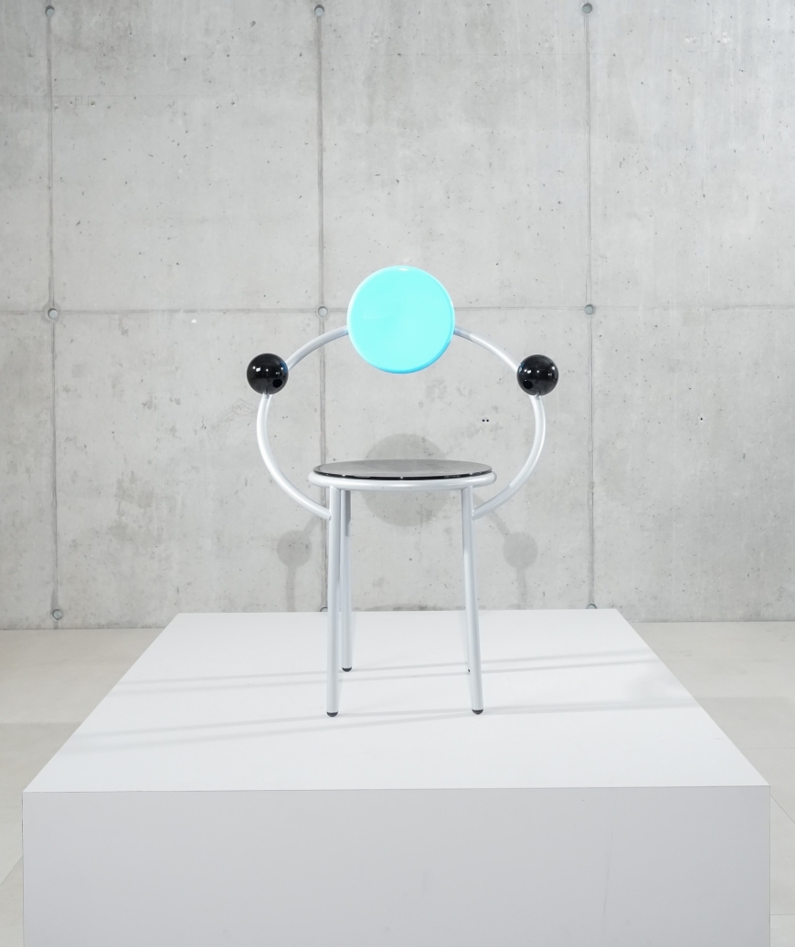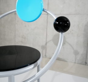 First (1983) is een iconische en sculpturale stoel waarin de speelsheid van Memphis wordt verbeeld. Met een dynamisch silhouet dat refereert aan de kinetische kunst van Alexander Calder, combineert deze stoel ambachtelijke verfijning met een industriële finesse. De heldere blauwe verstelbare rugleuning vormt samen met de twee zwarte bolvormige armleuningen een karaktervolle én expressieve compositie.