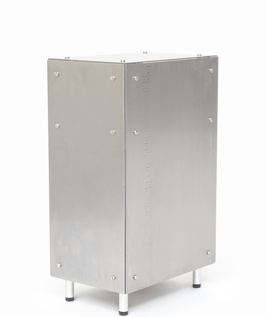 Dit nachtkastje is volledig uitgevoerd in ongecoat, onbewerkt staal — een materiaal dat zichtbaar karakter ontwikkelt door roestvorming over tijd, wat onderdeel is van de esthetiek en het verhaal van het object.
