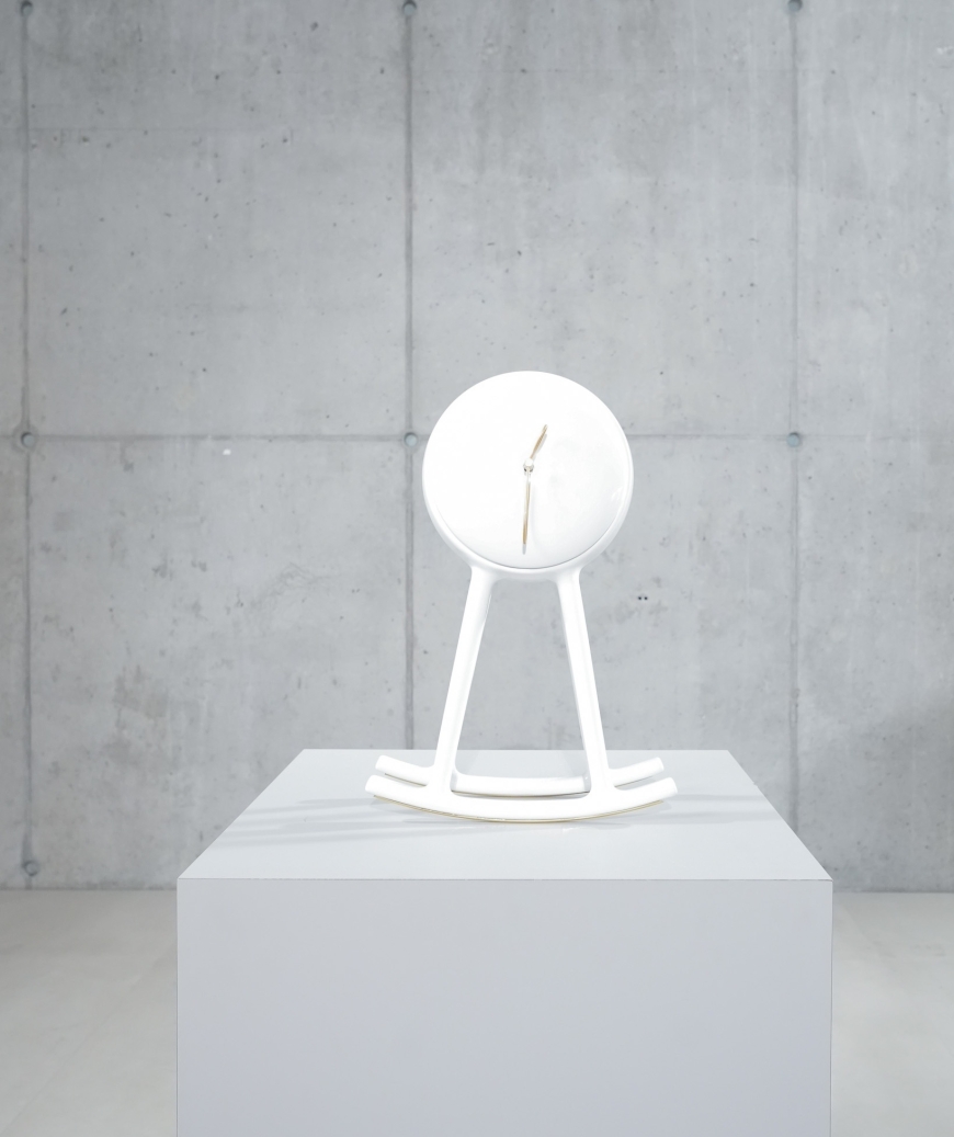 De Infinity Clock is een elegante keramische tafelklok ontworpen door Nika Zupanc. Het ontwerp kenmerkt zich door een sierlijke, schommelende structuur en unieke wijzers die, wanneer ze elkaar ontmoeten, een intrigerend visueel effect creëren dat direct weer oplost. Deze klok combineert functionaliteit met een artistieke esthetiek en voegt een verfijnd accent toe aan elk interieur.