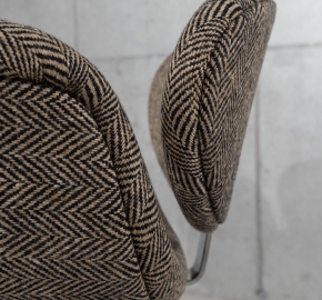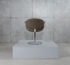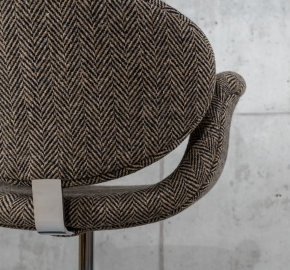 Geperste beukenhouten kuip met schuimvulling, volledig bekleed met stof Finn Black Natural. Onderstel van gepoedercoat of gepolijst metaal (schijf- of kruisvoet mogelijk).
