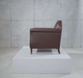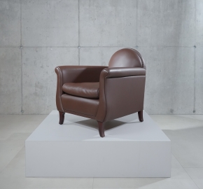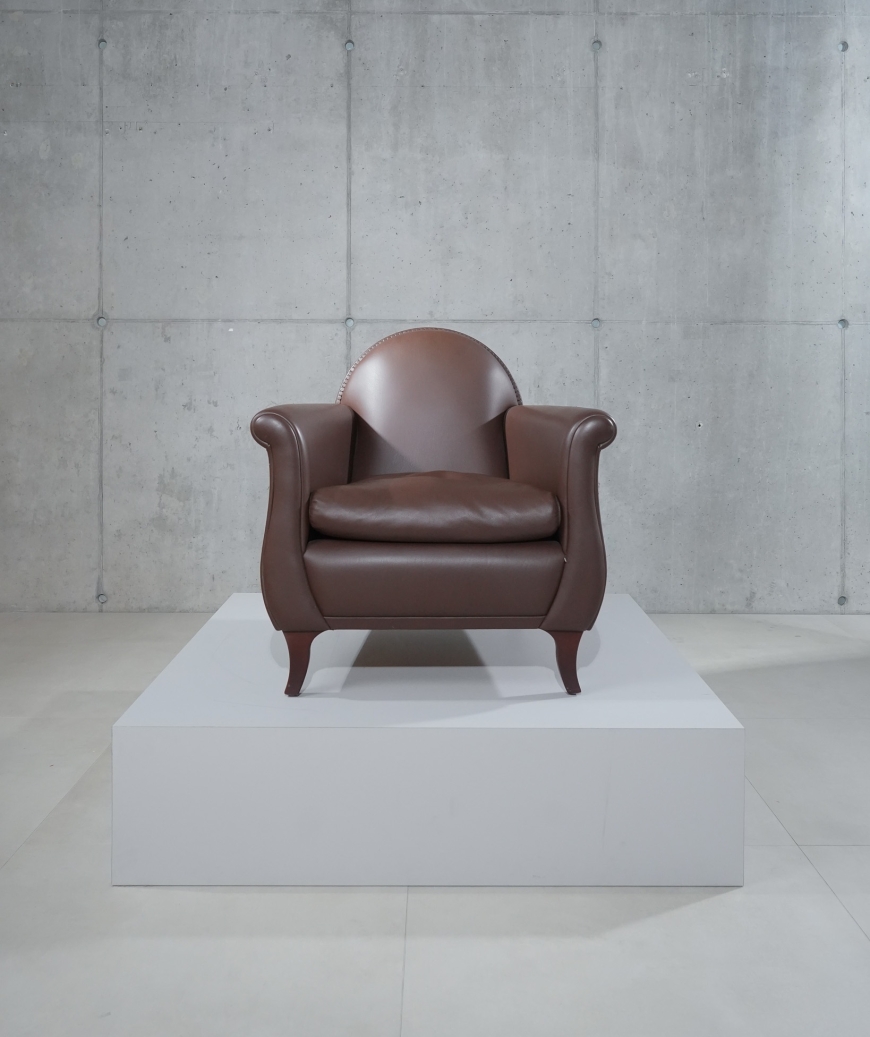 De Lyra fauteuil, geïntroduceerd in 1934 als een doorontwikkeling van het oorspronkelijke Lira-model uit 1916, straalt klassieke elegantie en verfijning uit. De afgeronde rugleuning, sierlijke armleuningen en diepe zit bieden zowel comfort als karakter. De met leer beklede siernagels langs de bovenrand van de rugleuning geven het ontwerp een tijdloze uitstraling. De bruine lederen uitvoering benadrukt de warme, traditionele sfeer en het ambachtelijke vakmanschap van Poltrona Frau.