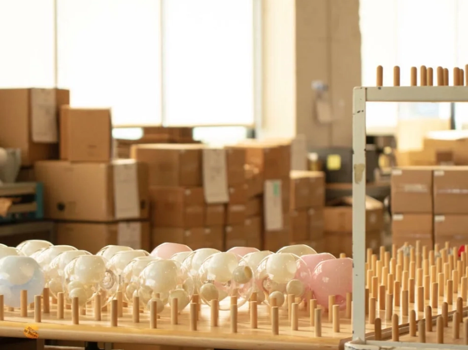 Mondgeblazen glasobjecten die afzonderlijk of in groepen worden toegepast en zacht licht verspreiden.