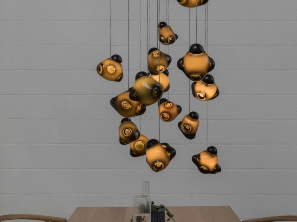 Bocci onderzoekt hoe glas zich gedraagt wanneer het wordt geblazen, vervormd of gelaagd. Daardoor hebben de armaturen een herkenbare textuur en een subtiele imperfectie die ieder stuk uniek maakt.