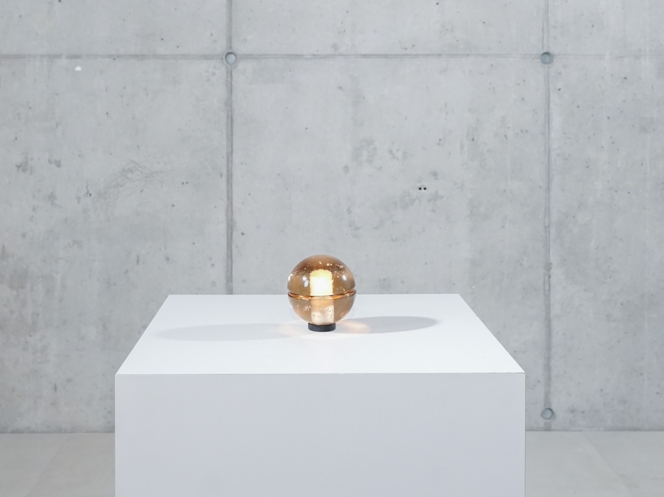Een serie van massief glazen bollen waarin kleine luchtinsluitingen zorgen voor een zachte verdeling van het licht. De vorm is eenvoudig, maar de textuur geeft een warme, rustige uitstraling.