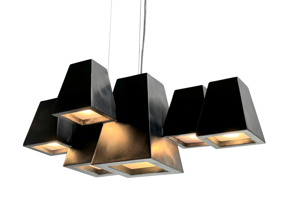 Een lichtobject waarin industriële materialen en geometrische ordening samenkomen, resulterend in een ingetogen maar karaktervolle lichtbron.