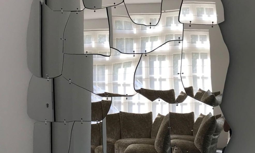Een mozaïek van spiegelstukjes kenmerkt deze tafel met een onregelmatig blad, verkrijgbaar in verschillende maten.