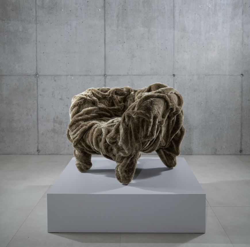 De zitting is gevuld met Gellyfoam® en veren, bedekt met een speciale stof met een textuur die lijkt op ijslagen. De rugleuning is zacht, gemaakt van polyester en bedekt met ecologische bont.