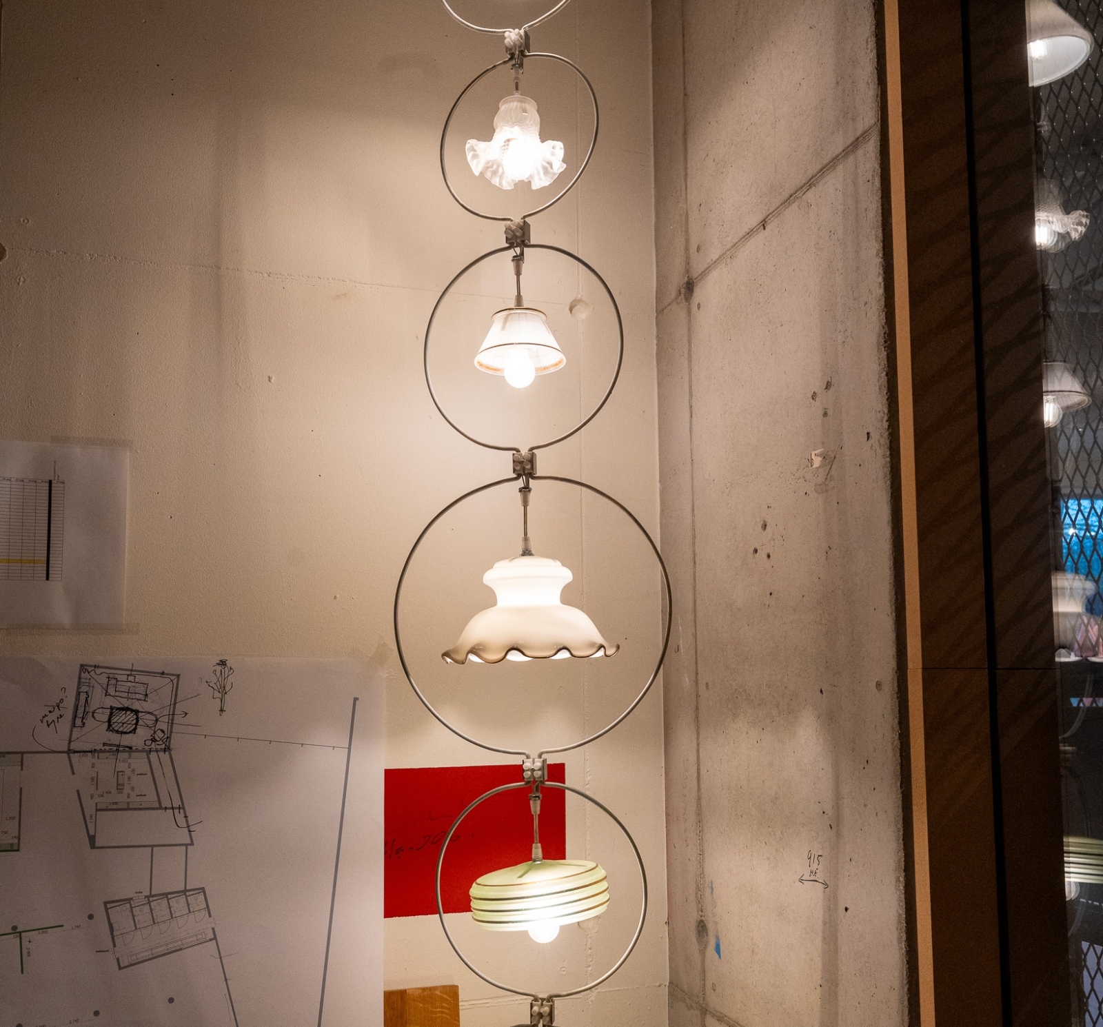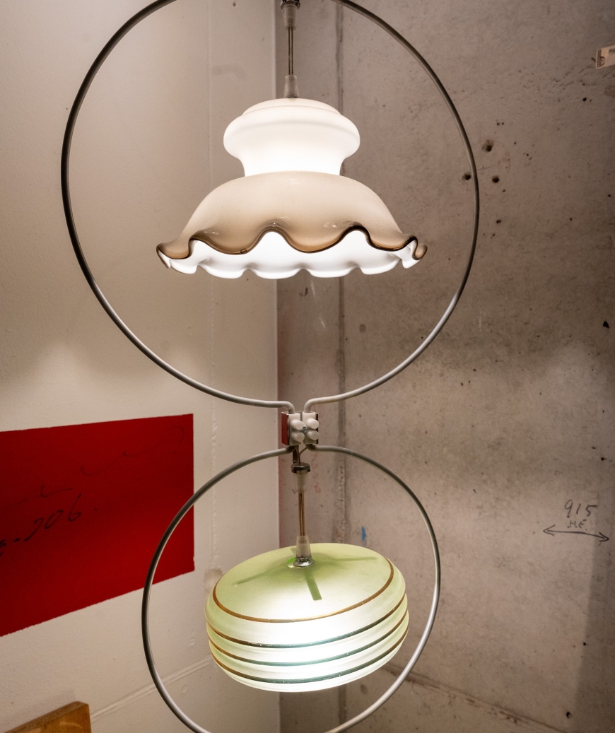 De Old Lampshade Lamp van Piet Hein Eek is een opvallende hanglamp ontstaan uit het verzamelen en hergebruiken van bestaande lampenkapjes. Eek verzamelt oude, diverse lampenkapjes en combineert ze tot één compositie, wat resulteert in een streng met meerdere cirkels die samen een ruimtelijk lichtobject vormen.