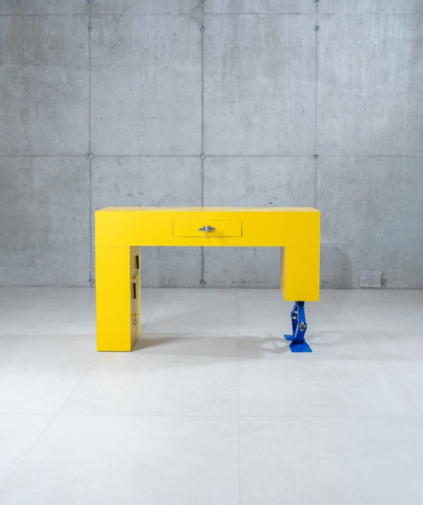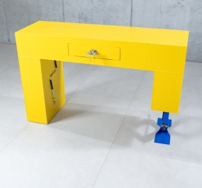 Met Panne omarmen Paul&Albert imperfectie. Deze side table is een verwijzing naar autopech en wordt ondersteund door een autokrik. Ook de hendel van de krik is geïntegreerd in het ontwerp. De tafel is volledig gemaakt van staal. Bij het lassen is er opzettelijk gewerkt met ruwe lasnaden. Het is juist de onvolkomenheid en ruwheid die dit ontwerp een uniek en persoonlijk karakter geven.