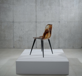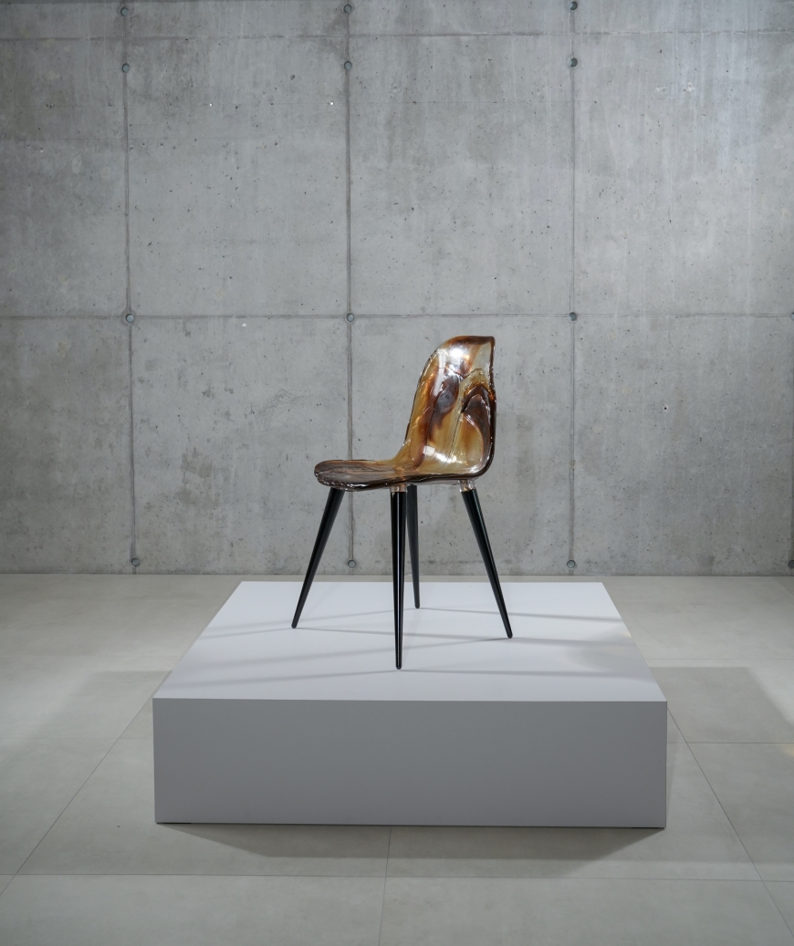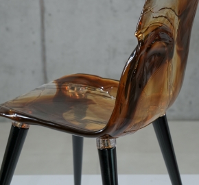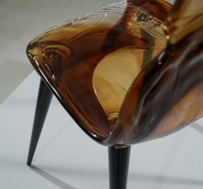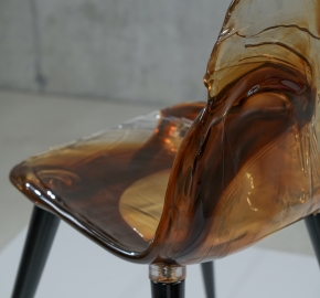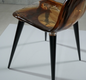 Een tijdloze en elegante stoel in warme ambertinten omhuld met transparant kristal. De zitting en rugleuning bestaan uit één geheel van polycarbonaat, gemonteerd op half glanzende zwarte poten. De stoel is geschikt voor elke omgeving dankzij zijn tijdloze elegantie.