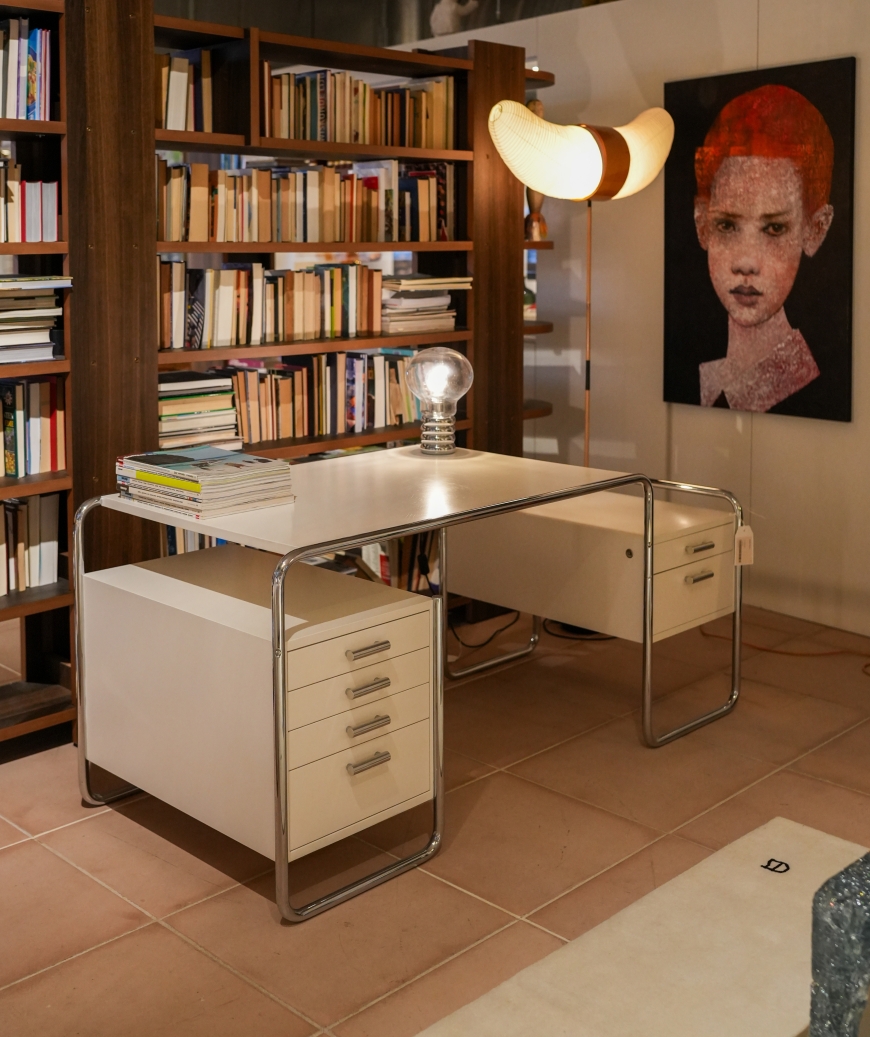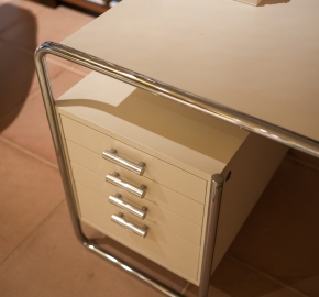 De S 285/2 is een iconisch Bauhaus-bureau dat de visie van Marcel Breuer op de synthese van kunst en techniek belichaamt. Het ontwerp combineert een elegant gebogen stalen buisframe met zwevende houten elementen, wat resulteert in een minimalistisch en functioneel meubelstuk. De tafel is voorzien van een geïntegreerde ladekast met drie ruime, afsluitbare lades, waardoor het bureau zowel esthetisch als praktisch is. Met zijn tijdloze ontwerp past de S 285/2 perfect in zowel moderne als klassieke interieurs.