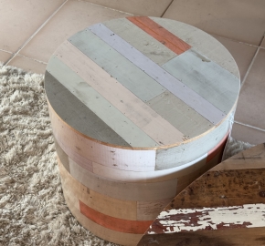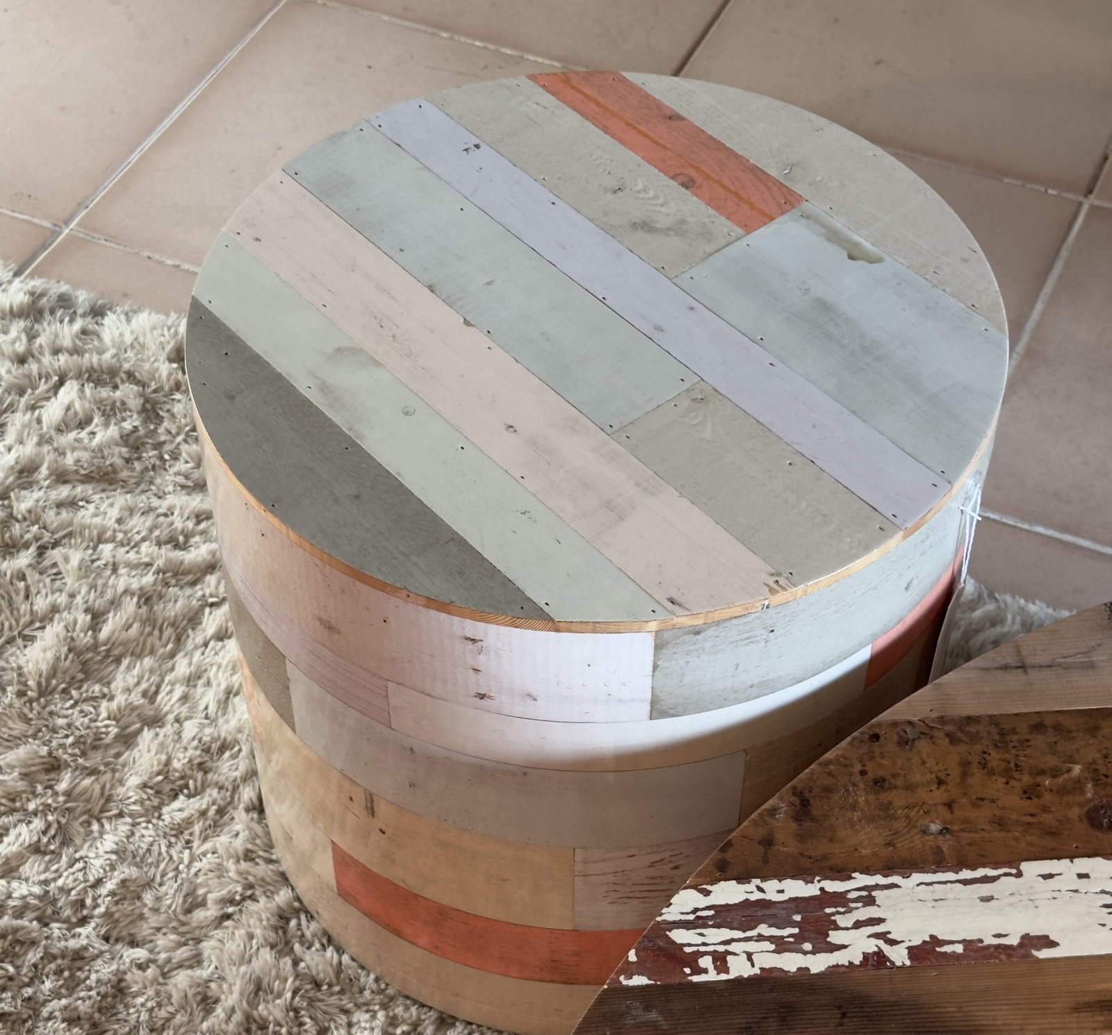 De Salonblok Rond van Piet Hein Eek is een compact en krachtig object uitgevoerd in karakteristiek sloophout. De cilindrische vorm geeft het blok een rustige, solide basis, terwijl de horizontaal opgebouwde houtstroken zorgen voor een levendig en gelaagd oppervlak.