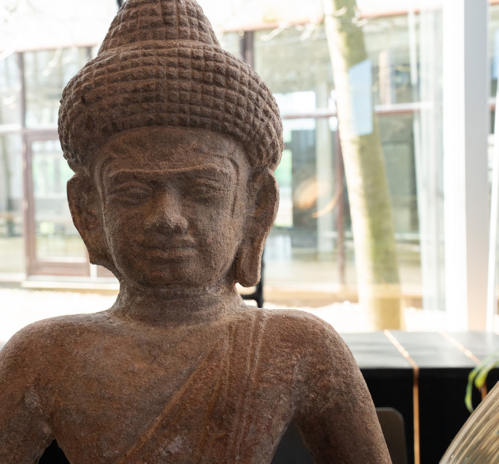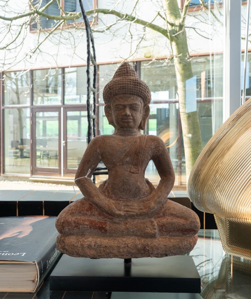 De Sandstone Sitting God uit de collectie van Panya Antiques is een intrigerend sculpturaal object dat het ambacht van eeuwenoude steenbewerking laat zien. Het beeld is gehouwen uit zandsteen, een materiaal dat door de eeuwen heen veel is gebruikt voor religieuze en ceremoniële beelden in Zuid- en Zuidoost-Azië vanwege zijn duurzaamheid en warme, organische textuur.