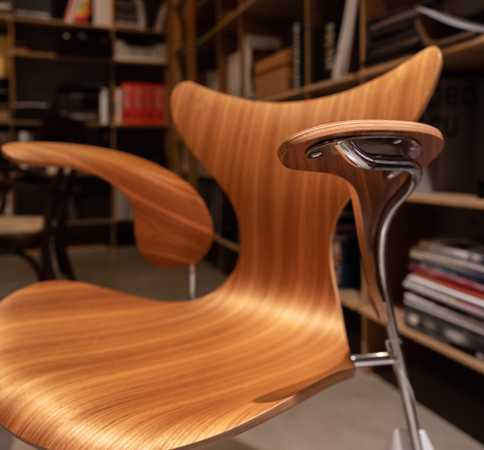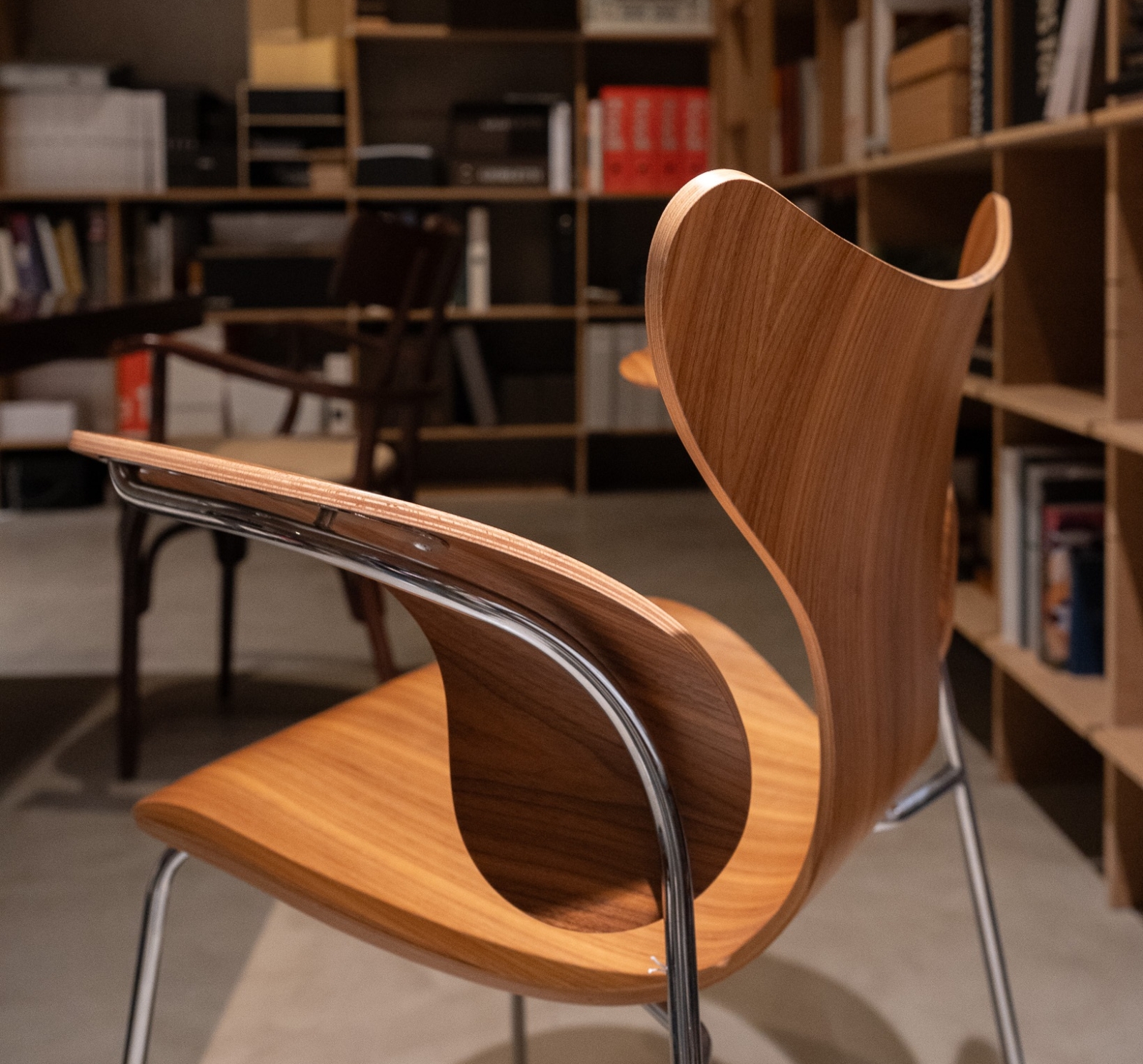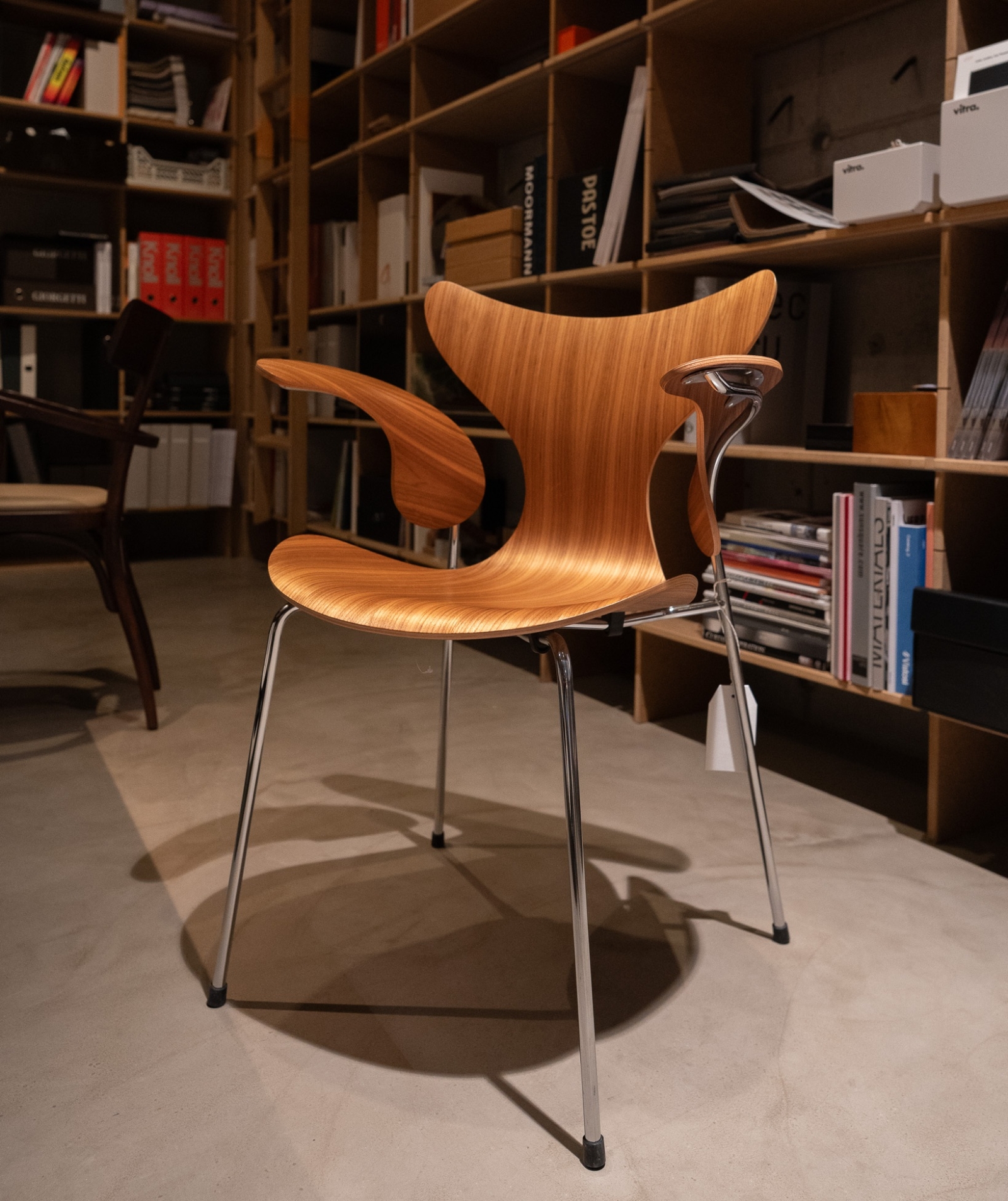 De Lily™ 3207 Armchair in Natural Veneer (Walnut), H 46 cm van Fritz Hansen is een iconische designstoel uit de Lily-serie, ontworpen door Arne Jacobsen — een klassieker binnen modern meubeldesign. De vorm is elegant en evenwichtig: een subtiel gebogen zitschaal in gelamineerd fineer rust op een verfijnd chromen stalen frame, wat zorgt voor een lichte, serene aanwezigheid aan tafel of in een zithoek.