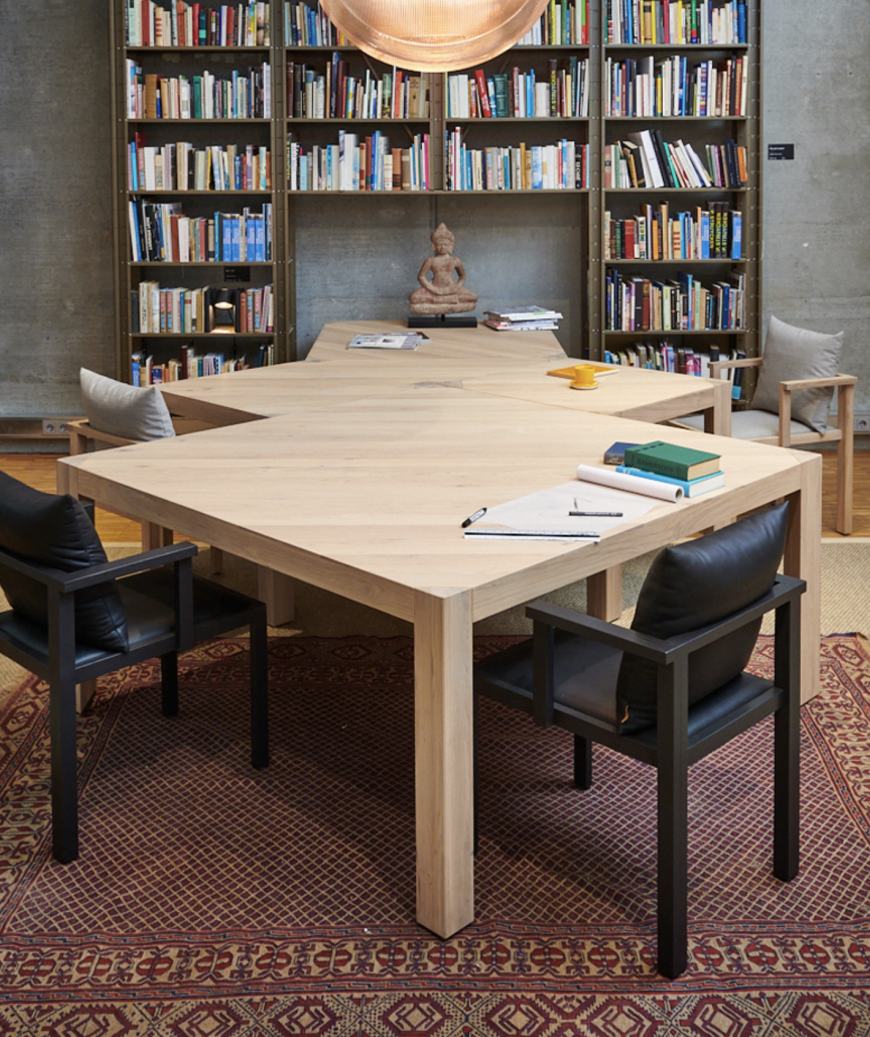 De Kodama is een massief eikenhouten designtafel uit de collectie van Pilat&Pilat, ontworpen door Bart Vos. De tafel maakt deel uit van een modulair systeem van verschillende geometrische tafelvormen die afzonderlijk gebruikt kunnen worden of gecombineerd tot grotere opstellingen. Hierdoor werkt het ontwerp zowel als eettafel als in projectinterieurs waar flexibiliteit belangrijk is.
