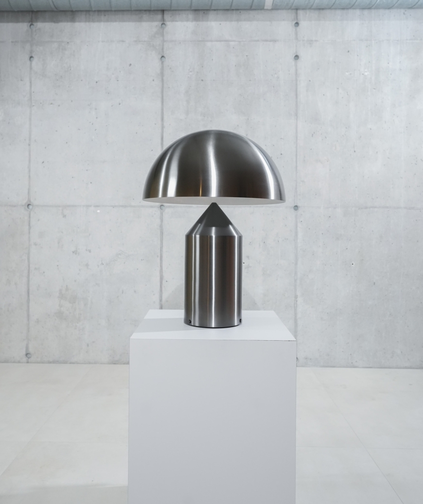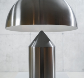 De Atollo tafellamp is een iconisch ontwerp van Vico Magistretti uit 1977, dat sindsdien een archetype is geworden voor tafellampen. De lamp combineert eenvoudige geometrische vormen—cilinder, kegel en halve bol—tot een elegant en tijdloos design. De nieuwste uitvoering is beschikbaar in een verfijnde satijn zwart nikkel afwerking, die de lamp een sterke en strakke esthetiek geeft. De Atollo lamp is uitgerust met een dimbaar verlichtingssysteem en is verkrijgbaar in drie verschillende maten. Dit ontwerp heeft in 1979 de prestigieuze Compasso d'Oro award gewonnen en maakt deel uit van de permanente collecties van vooraanstaande musea wereldwijd.