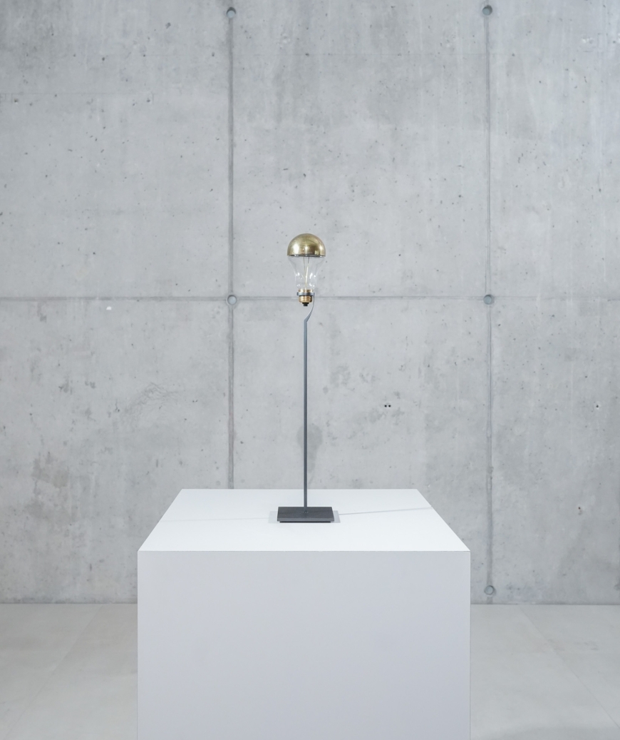 Borosilicaat glazen bol met messinggecoate (onbehandelde) kap met magneet; E27-fitting van massief messing; voetstuk van gebrand en behandeld ijzer.