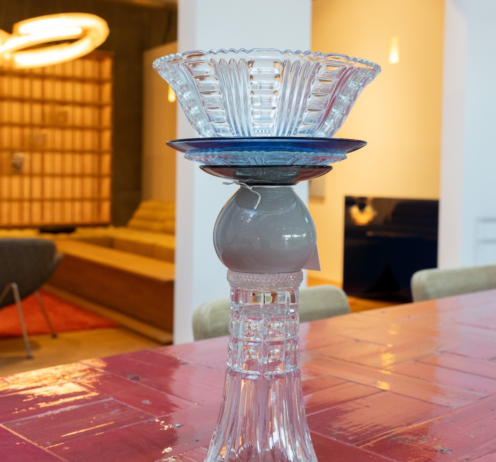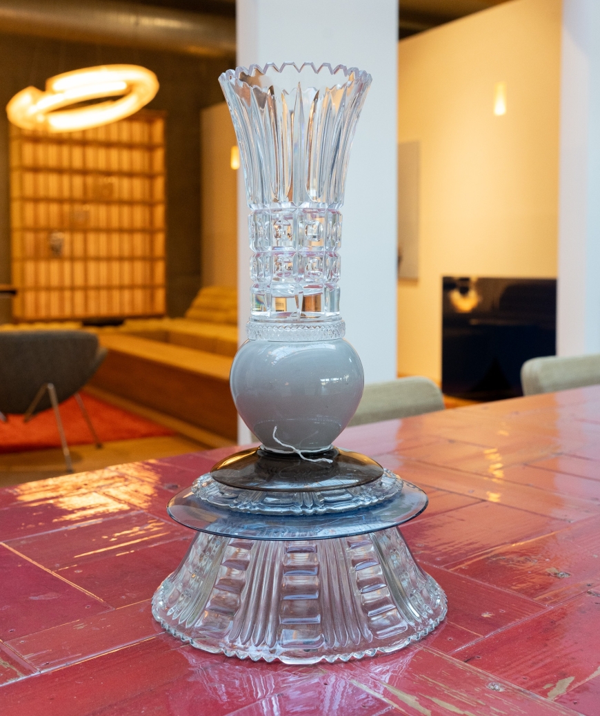 De Vaas/Tafelstuk Vintage Glaswerk van Studio Kalff is een sculpturaal object dat materiaal en herinnering combineert. Studio Kalff werkt met bestaande glasvoorwerpen — vaak vintage glazen vaasjes en glaswerk — als grondstof, en transformeert ze tot een nieuw, coherenter geheel