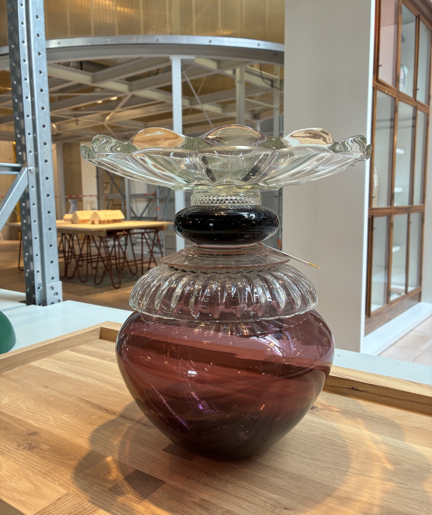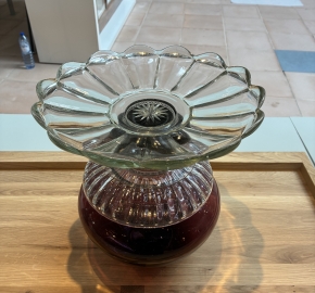 De Vaas/Tafelstuk Vintage Glaswerk van Studio Kalff is een sculpturaal object dat materiaal en herinnering combineert. Studio Kalff werkt met bestaande glasvoorwerpen — vaak vintage glazen vaasjes en glaswerk — als grondstof, en transformeert ze tot een nieuw, coherenter geheel