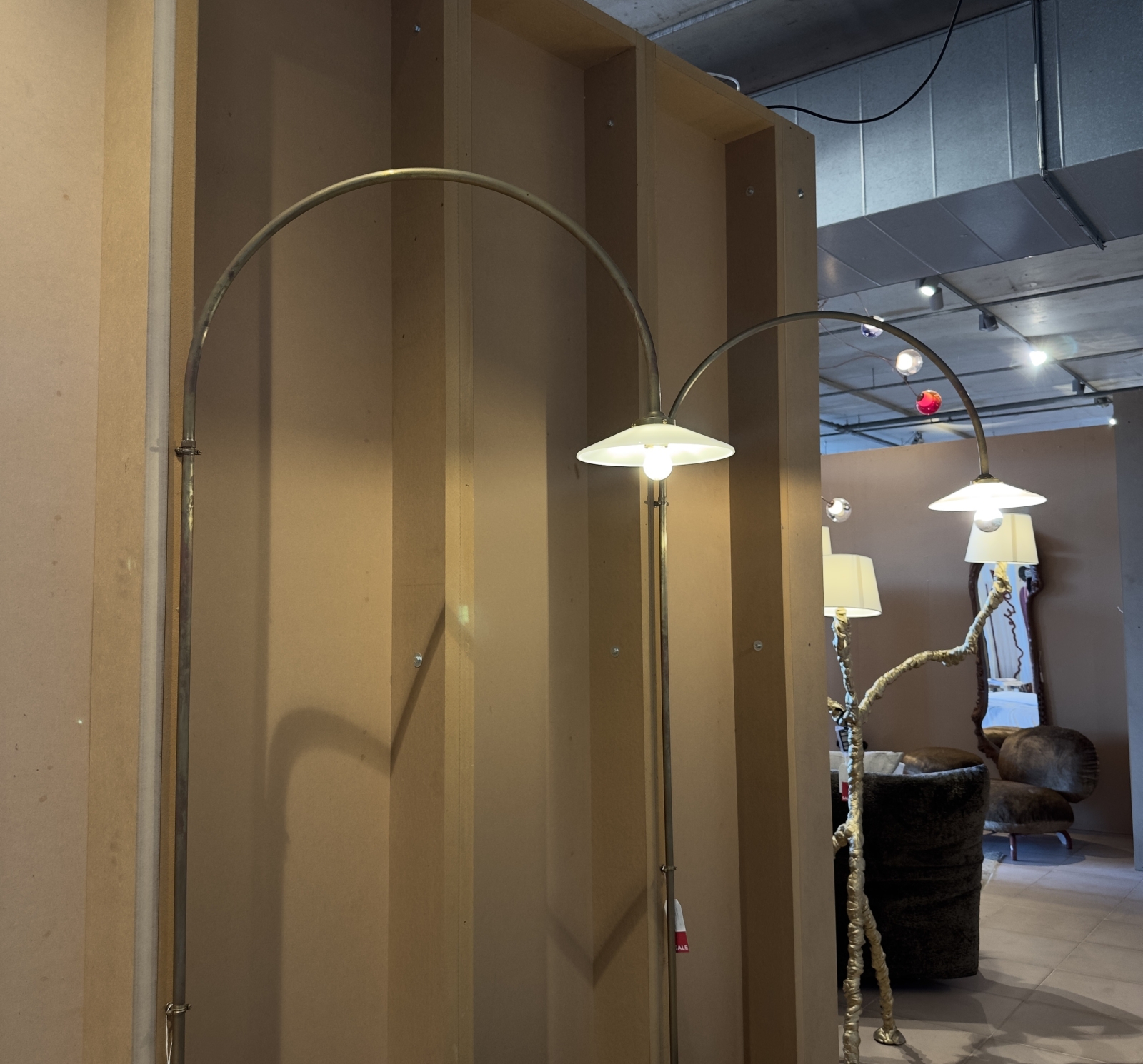 Deze grafische designlamp komt uit de collectie van valerie_objects, ontworpen door Muller Van Severen. De lamp bestaat uit een eenvoudig gebogen stalen buis met een klassieke kap aan het uiteinde, waardoor het geheel oogt als een lijntekening die in de ruimte is getekend. Het ontwerp ontstond in 2011 uit een praktisch probleem in hun studio en groeide uit tot een van de eerste en bekendste ontwerpen van het duo.
