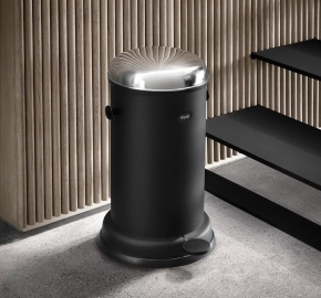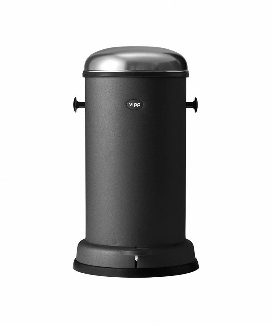 Minimalistische pedaalemmer van Vipp, gebaseerd op het originele ontwerp van Holger Nielsen uit 1939. De prullenbak is gemaakt van gepoedercoat staal met een roestvrijstalen deksel en een uitneembare binnenemmer. Het pedaalmechanisme opent het deksel handsfree en sluit zacht dankzij een geïntegreerde demper. Een rubberen ring aan de onderzijde beschermt de vloer en zorgt voor een luchtdichte sluiting.