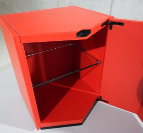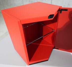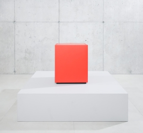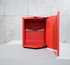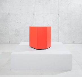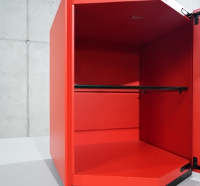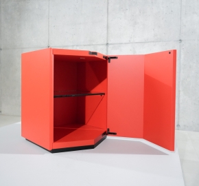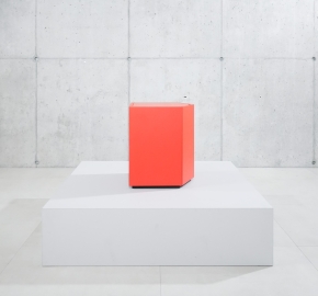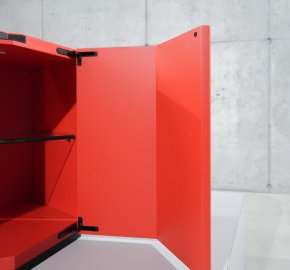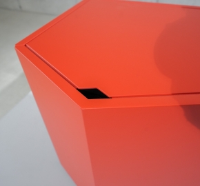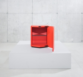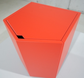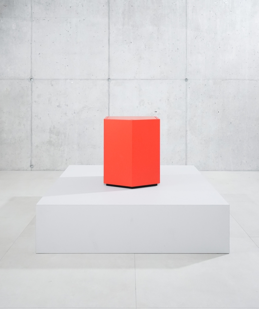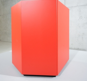 Z24 Nightstand 728 in oranje. Het Z24 728 nachtkastje, ontworpen door het Belgische duo Muller Van Severen in 2024, combineert functionaliteit met een sculpturale esthetiek. Een opvallend kenmerk van de Z24-collectie is het zigzagpatroon op de voorkant, dat afhankelijk van de lichtinval een dynamisch spel van licht en schaduw creëert. Dit geeft het meubel een unieke diepte en maakt het een blikvanger in elke slaapkamer.