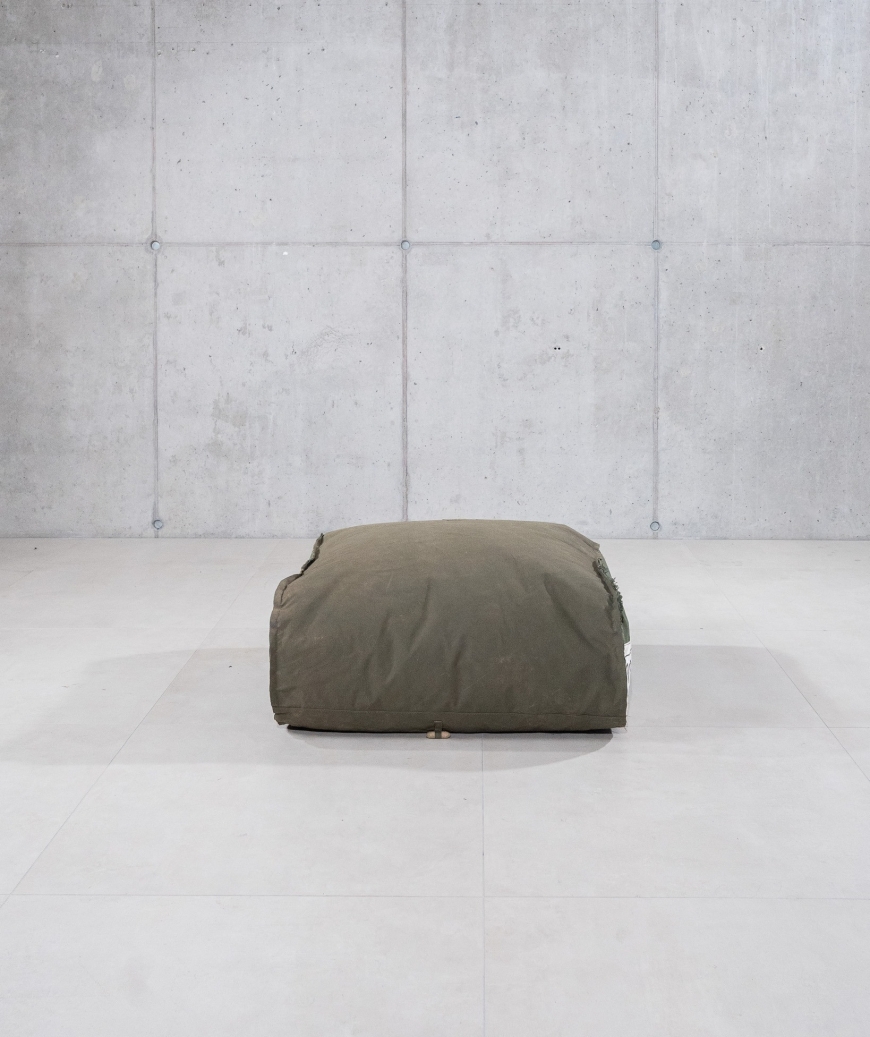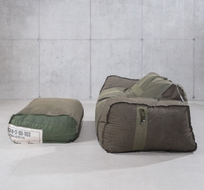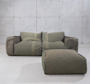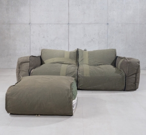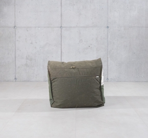 De Zitzak Poef is ontworpen als losse zitoplossing, of als aanvulling op de bijbehorende buitenbank. Gemaakt van dezelfde gerecyclede legertentstof biedt de poef ondersteuning als voetenbank, extra zitplek of losstaand object.